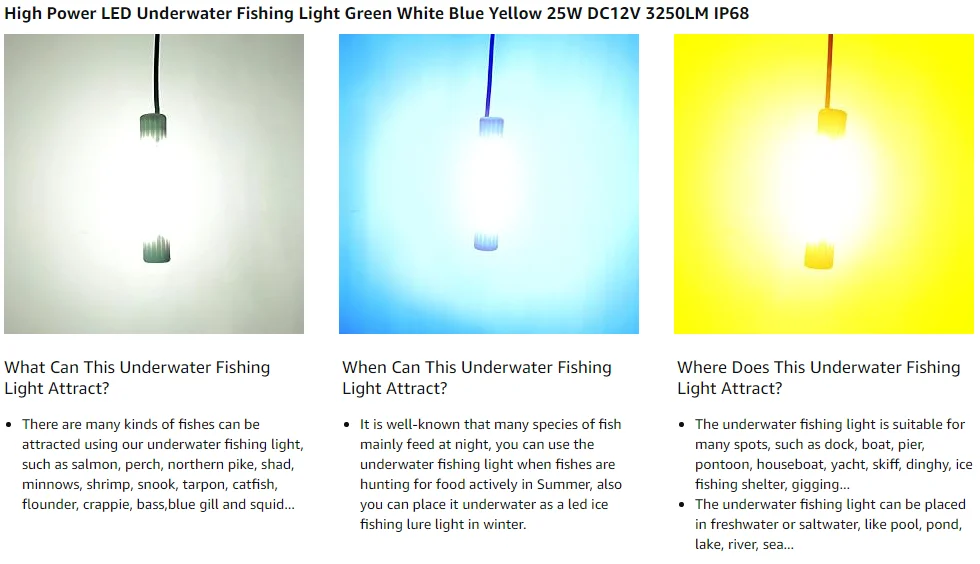 【Ampliamente utilizado】La luz/lámpara de pesca submarina atrae lubinas, cupcakes, truchas, percas, bagres, carpas y rótulas, pargos, peces de roca, calamares y más. La luz/lámpara se puede usar en su barco de pesca submarina, kayak, muelles, hielo, puentes o en su tanque de acuario.