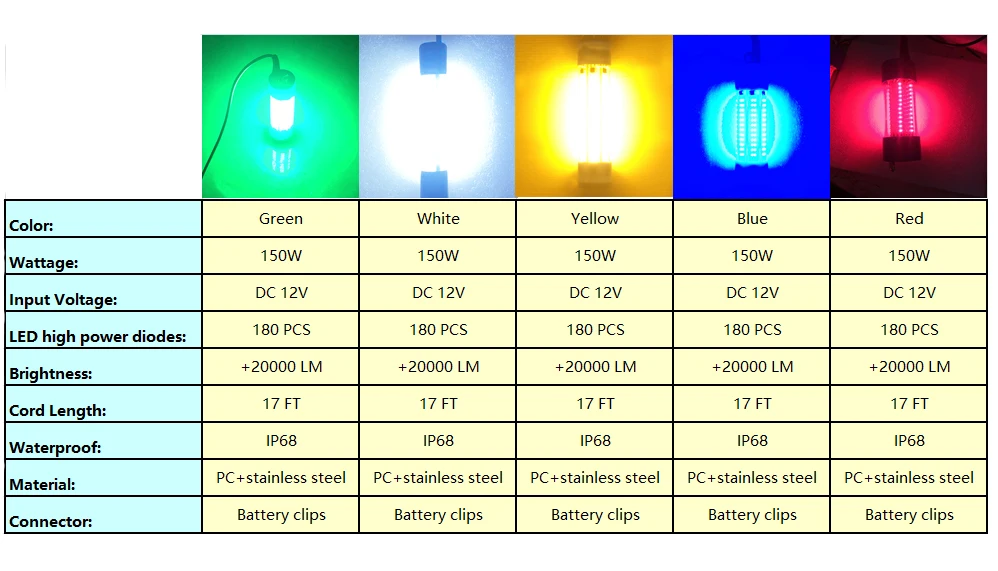 Luz de pesca submarina DC12V, 150W, 20000 lúmenes, lámpara sumergible para buscador de peces, señuelo de pesca nocturno, cebo, buscador de peces