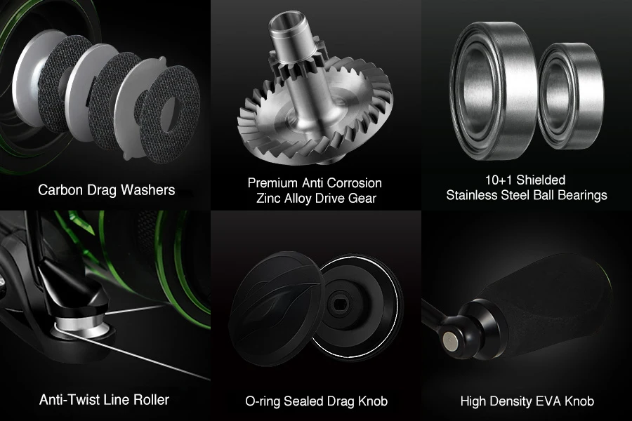 Mayor resistencia al agua-innovadora tecnología impermeable que incluye el buje de embrague unidireccional, placa de embrague unidireccional, arandela de acero inoxidable y rodamiento blindado de acero inoxidable, evita que el agua y la suciedad entren en la casa. Muy útil para mantener el mejor rendimiento para su carrete giratorio Viper X.