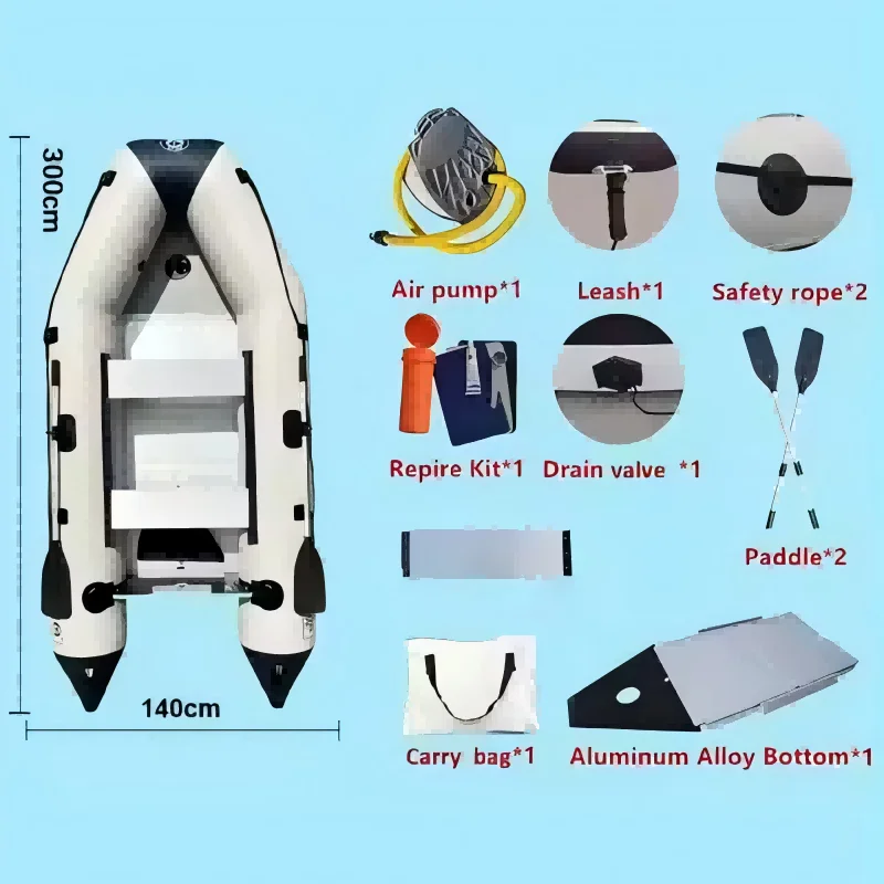 Accesorios: bomba de aire, paletas, kit de reparación, válvula de drenaje, mochila, cuerda de seguridad, tablero de asiento de madera, etc.