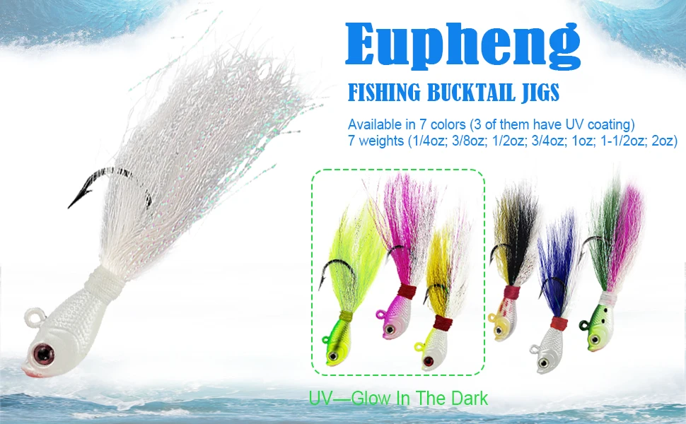 Eupheng ha incorporado elementos UV en los jigs bucktail que pueden crear un estímulo visual único para que los peces activen sus instintos depredadores. Salmon Redfish y trucha son más sensibles a los señuelos UV.