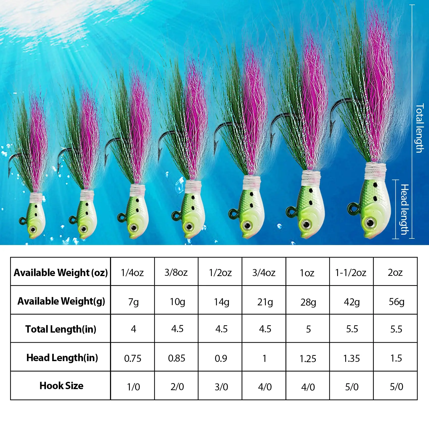 Paquete de 3. Disponible en 7 colores (3 de ellos con recubrimiento UV) y 7 pesos (1/4oz; 3/8oz; 1/2oz; 3/4oz; 1oz; 1-1/2oz; 2oz para capturar cualquier especie de agua dulce o salada.