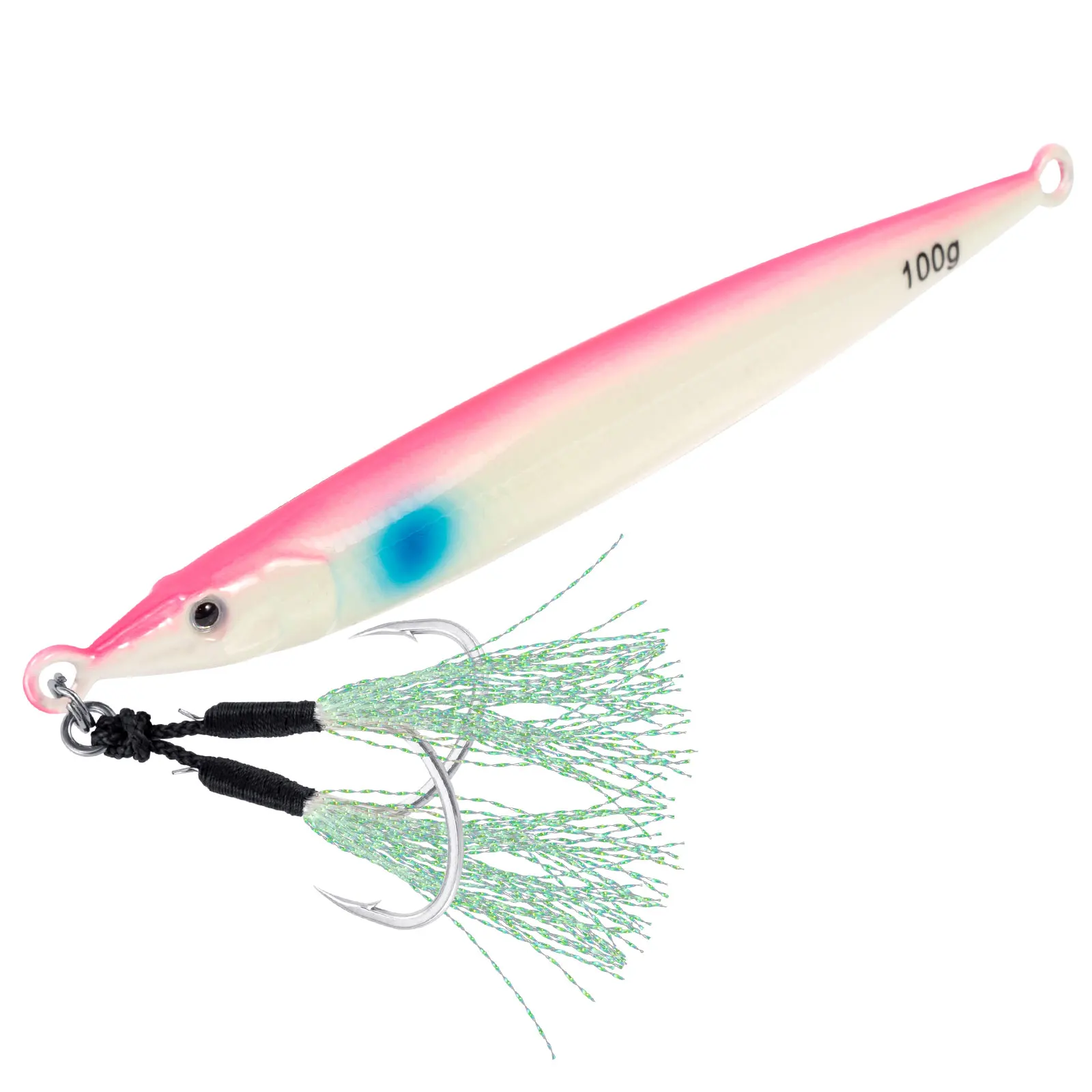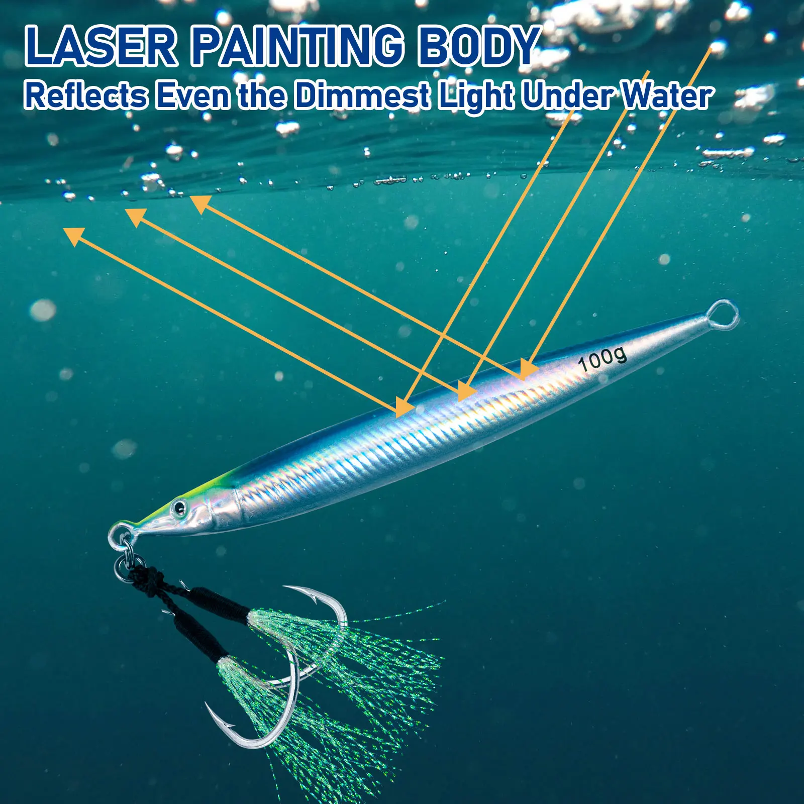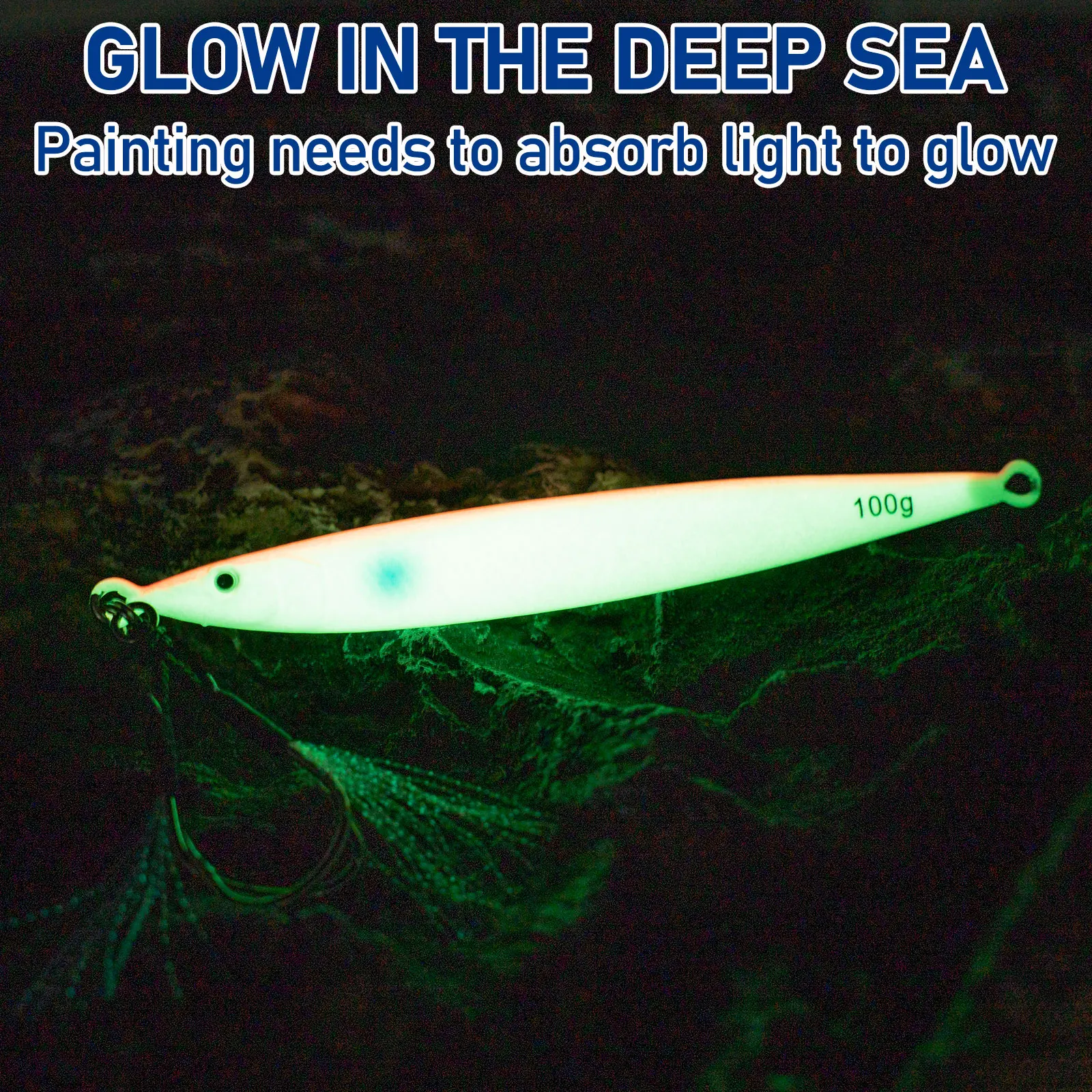 Special designed colorful multi-layer Laser Coating is able to reflect sunlight/moonlight/other light into fully-attractive colored bright light, which maximize the use of light and draw the game fish from a farther distance. Glow in dark fish jig design allow the predators to spot this vertical jig even when there is no external light source in deep sea.