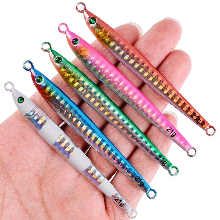 Plantilla de fundición de Metal superfino largo, 7g, 10g, 14g, 17g, 21g, para lanzar orilla, Jigging, señuelo de pesca, aparejos de cebo Artificial, 5 uds. Por lote