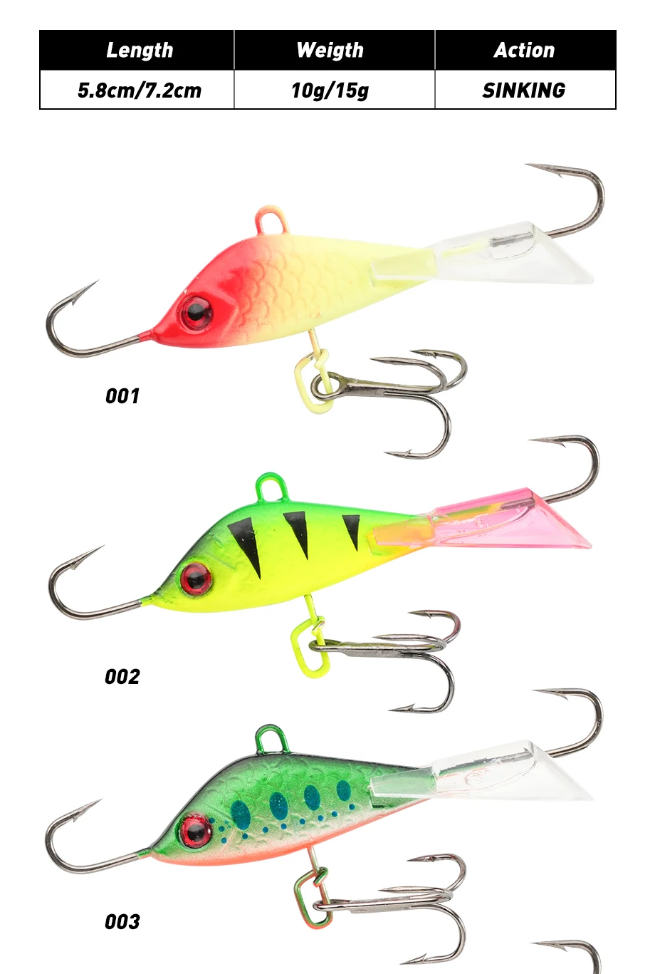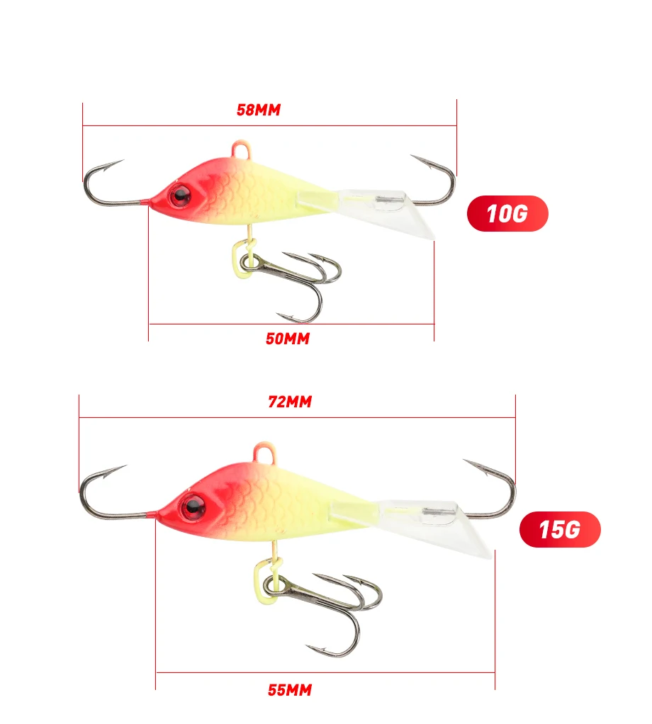 Disponibles en 10 gy 15 g, estos jigs ofrecen versatilidad para diferentes escenarios de pesca en hielo, atendiendo a diversas profundidades de agua y especies de peces.