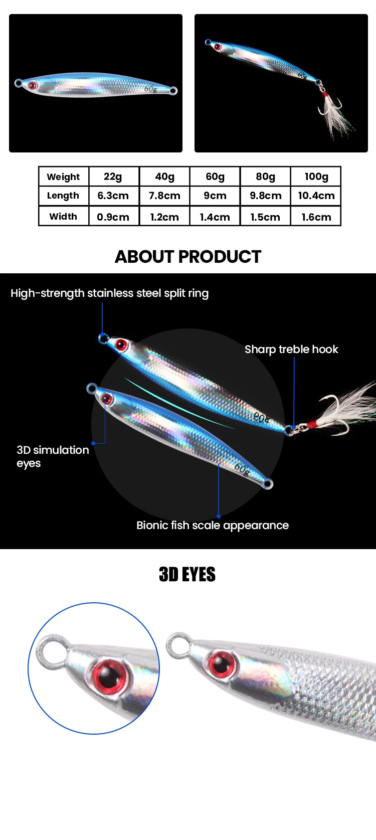 • Brillo en el agua :El brillo incorporado en el señuelo lo hace más visible en el agua, atrayendo a los peces de manera efectiva.