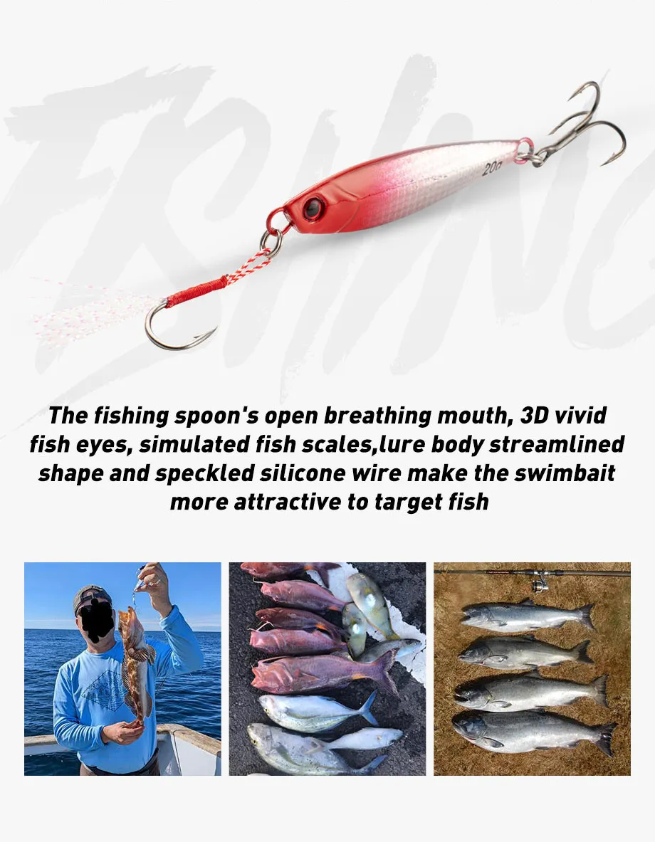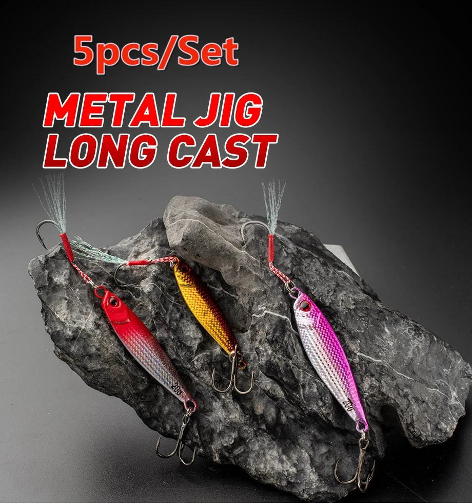 • Conjunto versátil:Este conjunto de 5 piezas incluye señuelos de diferentes pesos (10G, 15G, 20G), que se adaptan a diversas condiciones y preferencias de pesca.