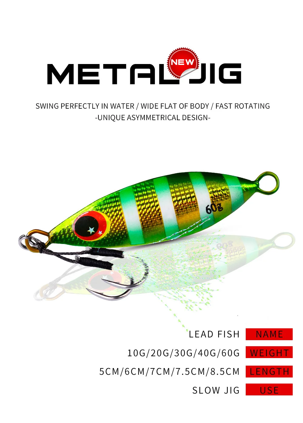 Señuelo de Pesca de Metal, Cebo Artificial, Cuchara de Agua Salada, Anzuelo de Ayuda de Jigging de Paso Lento, 10g, 20g, 30g, 40g, 60g