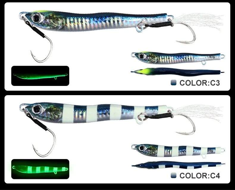 Plantilla de paso lento 40g60g80g plantilla de Metal fundido Jigging cuchara señuelo de pesca en la costa agua salada lubina títere atún Mahi cebo Artificial