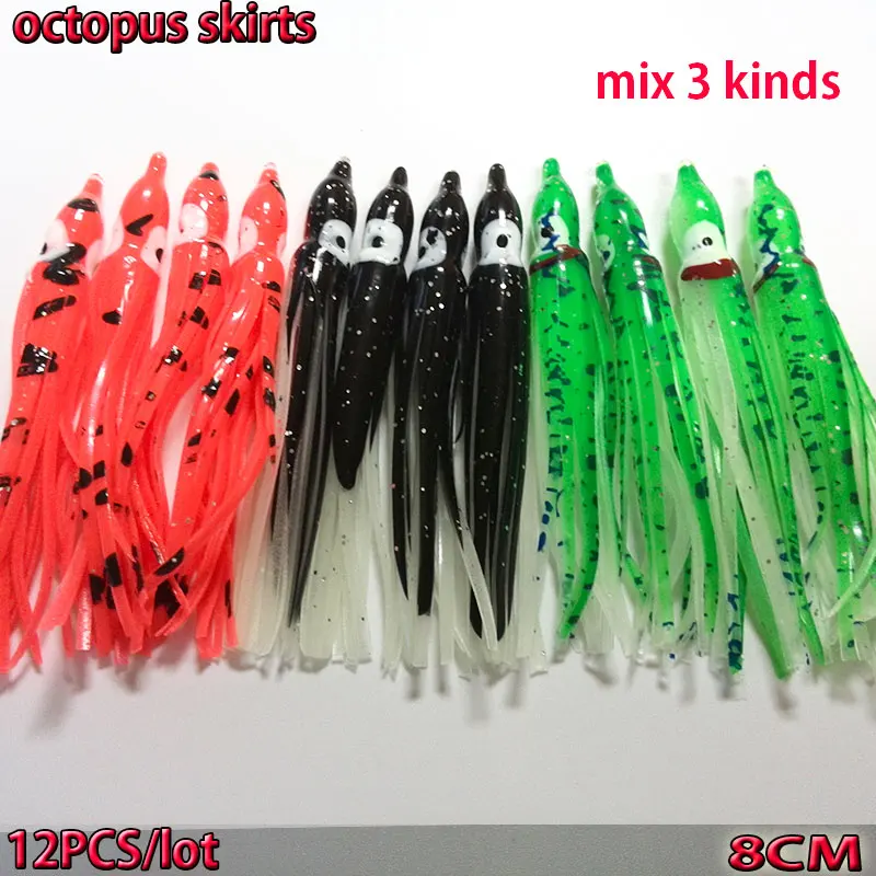 Plantilla de pesca de 3 colores, faldas de pulpo de calamar, longitud de 8CM, número: 12 unids/lote, 2019