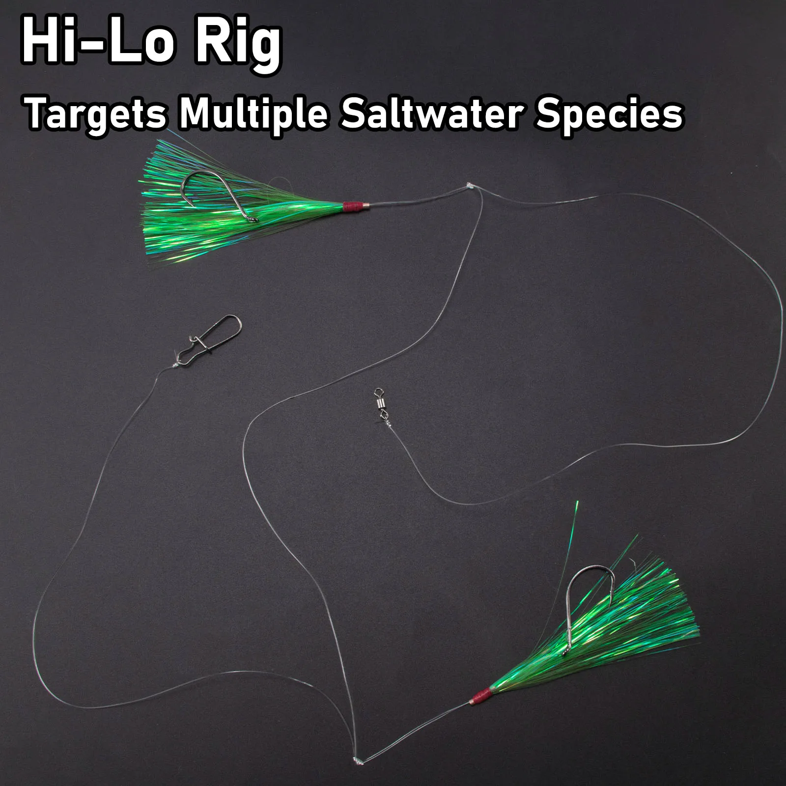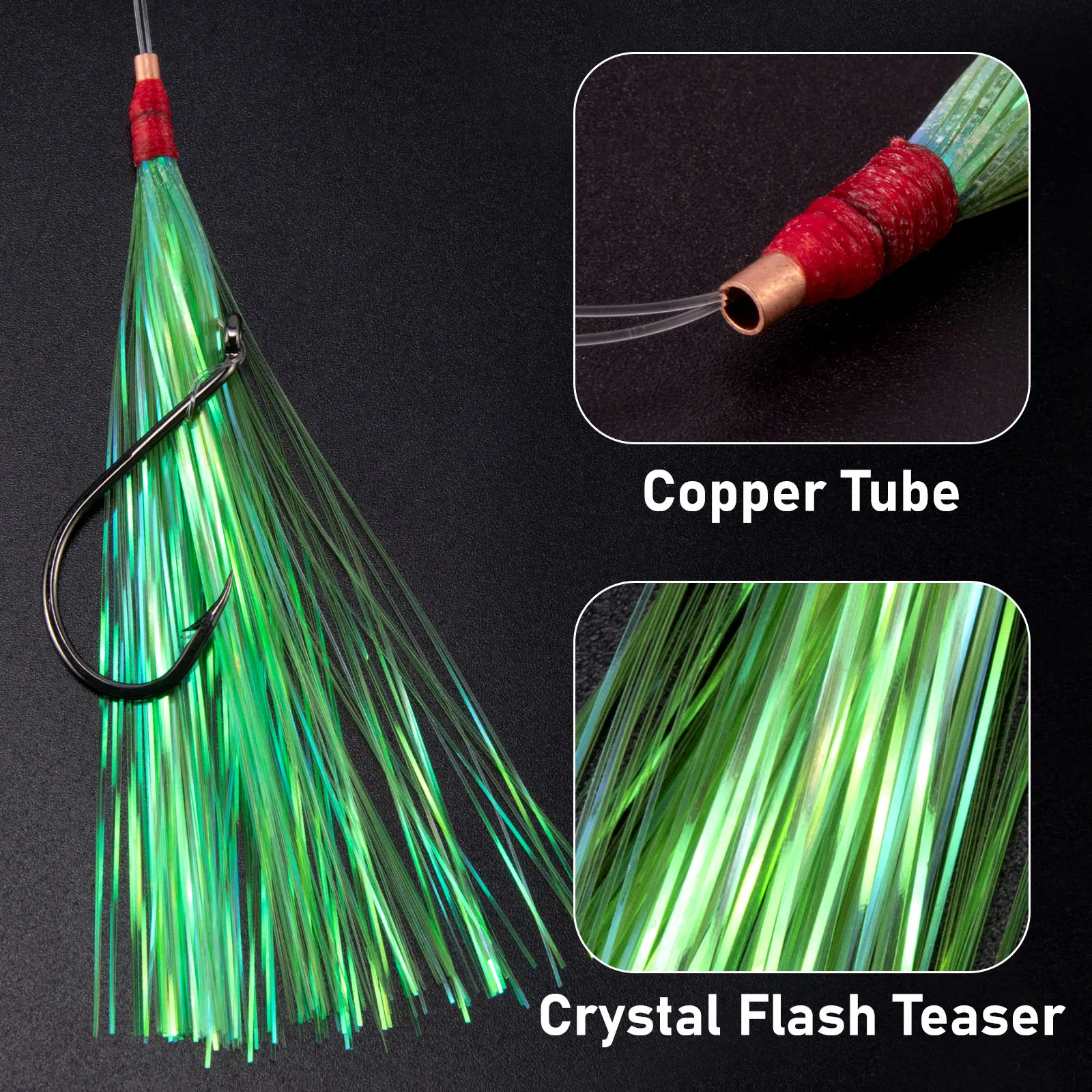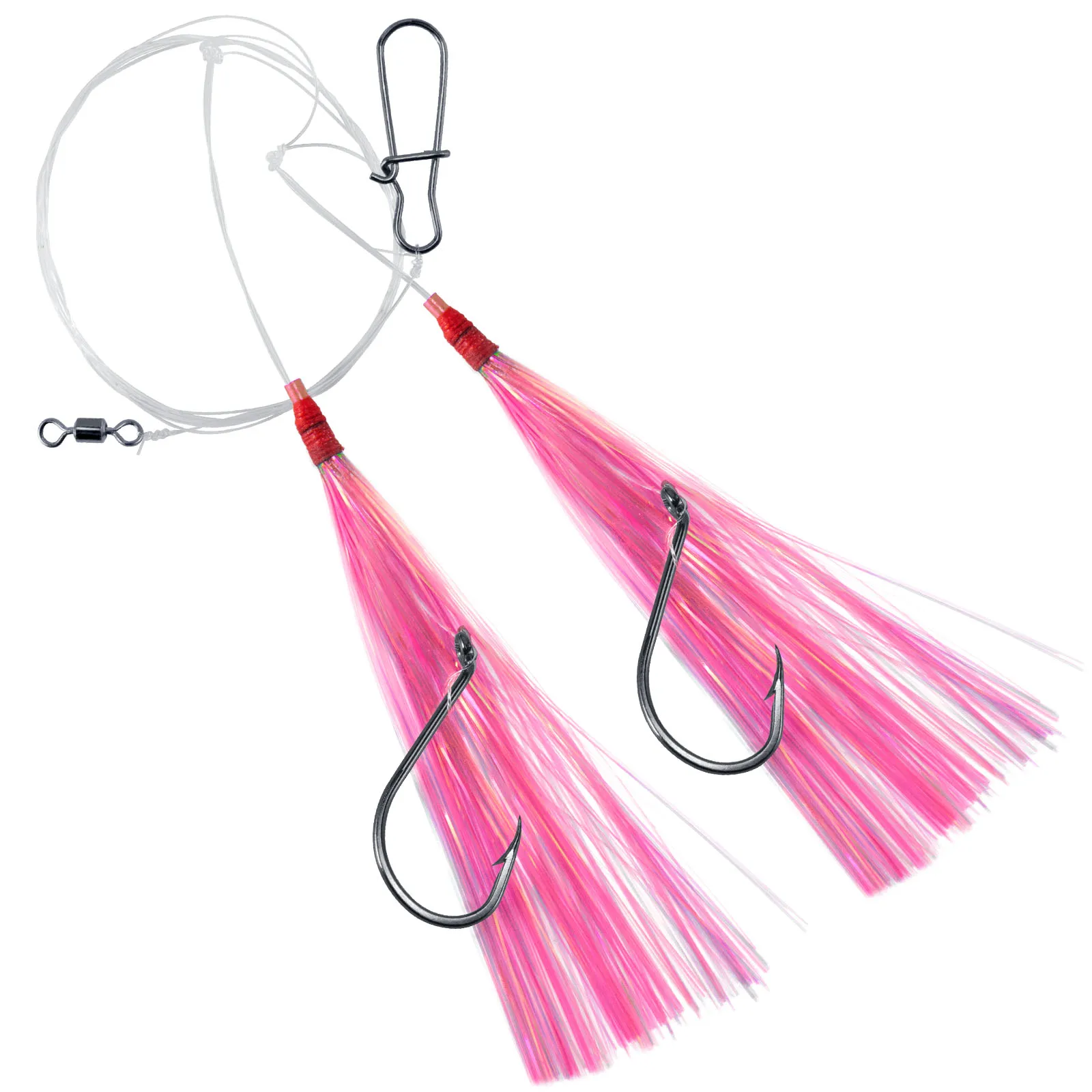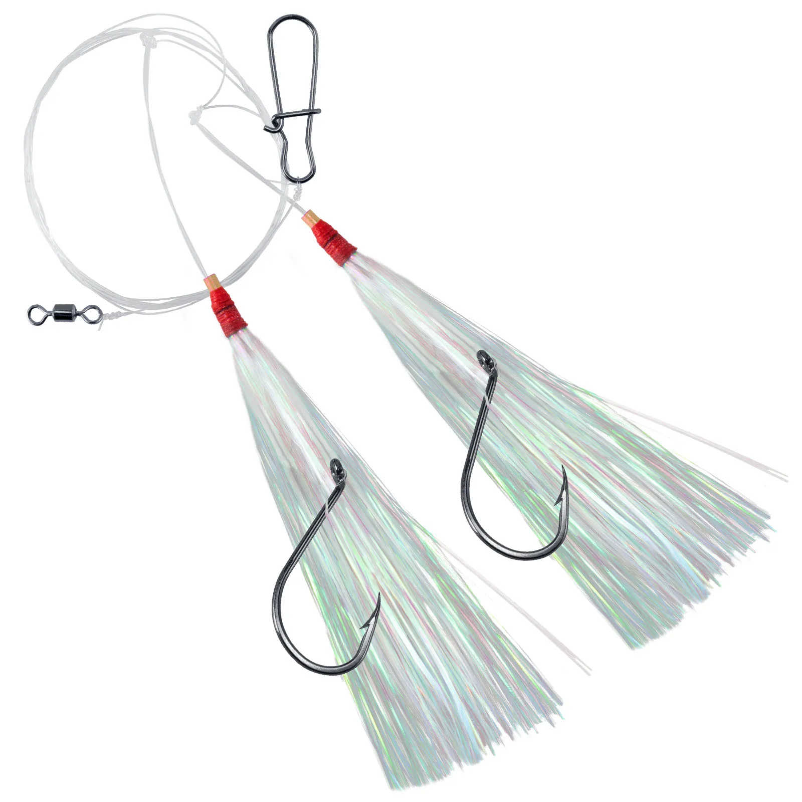 La plataforma cuenta con gancho de pulpo compensado de acero de alto carbono, giratorio de potencia de rodamiento de bolas, broche de doble bloqueo, cola de mylar atada a mano en un líder mono de 30lb.