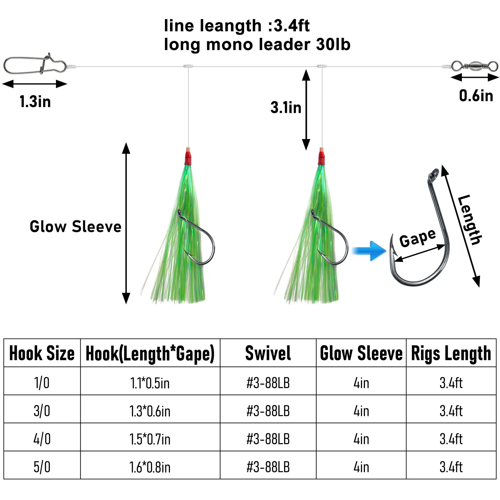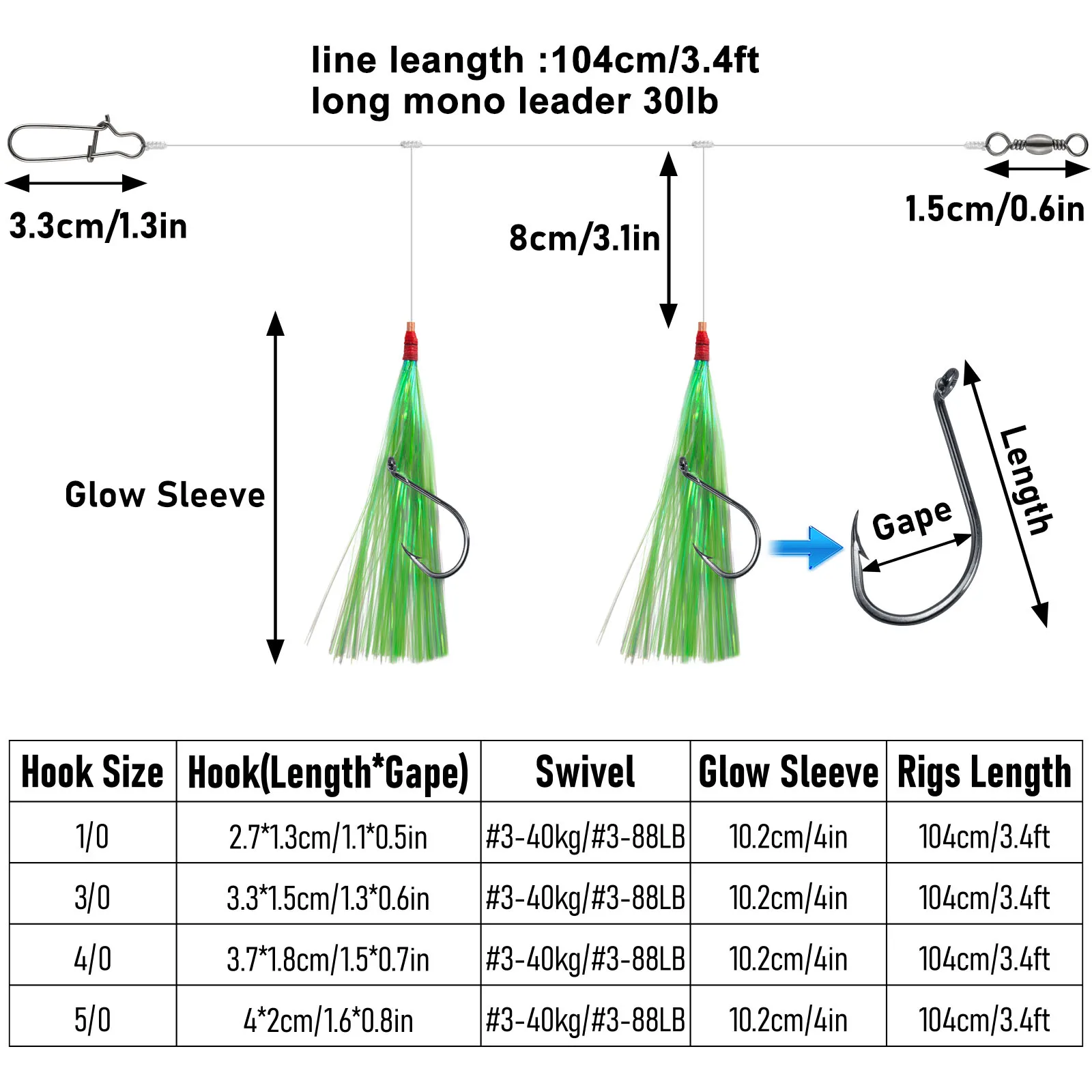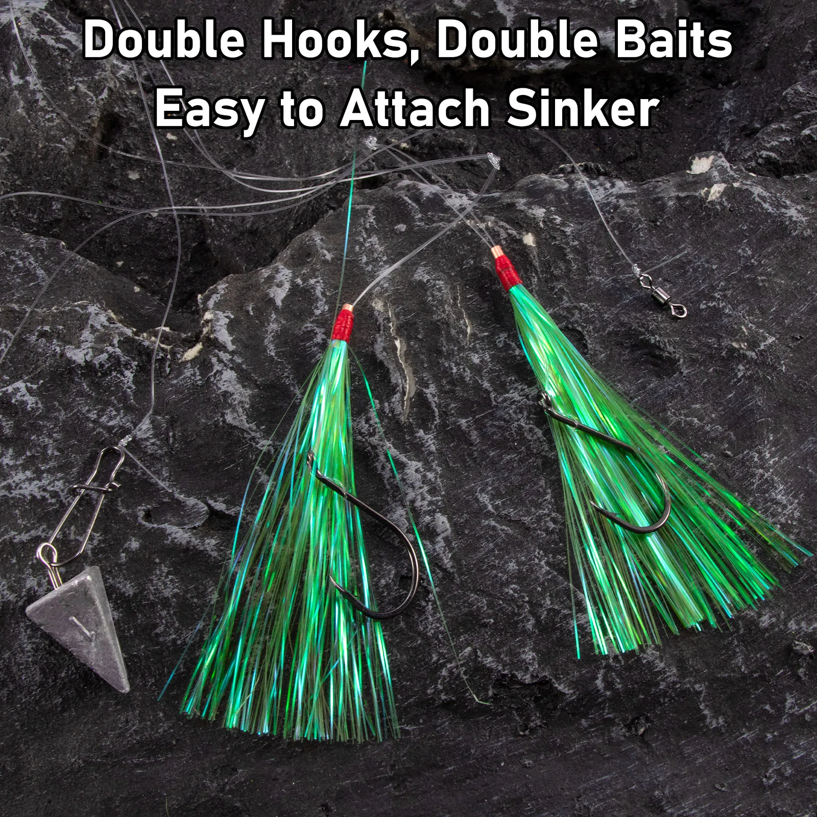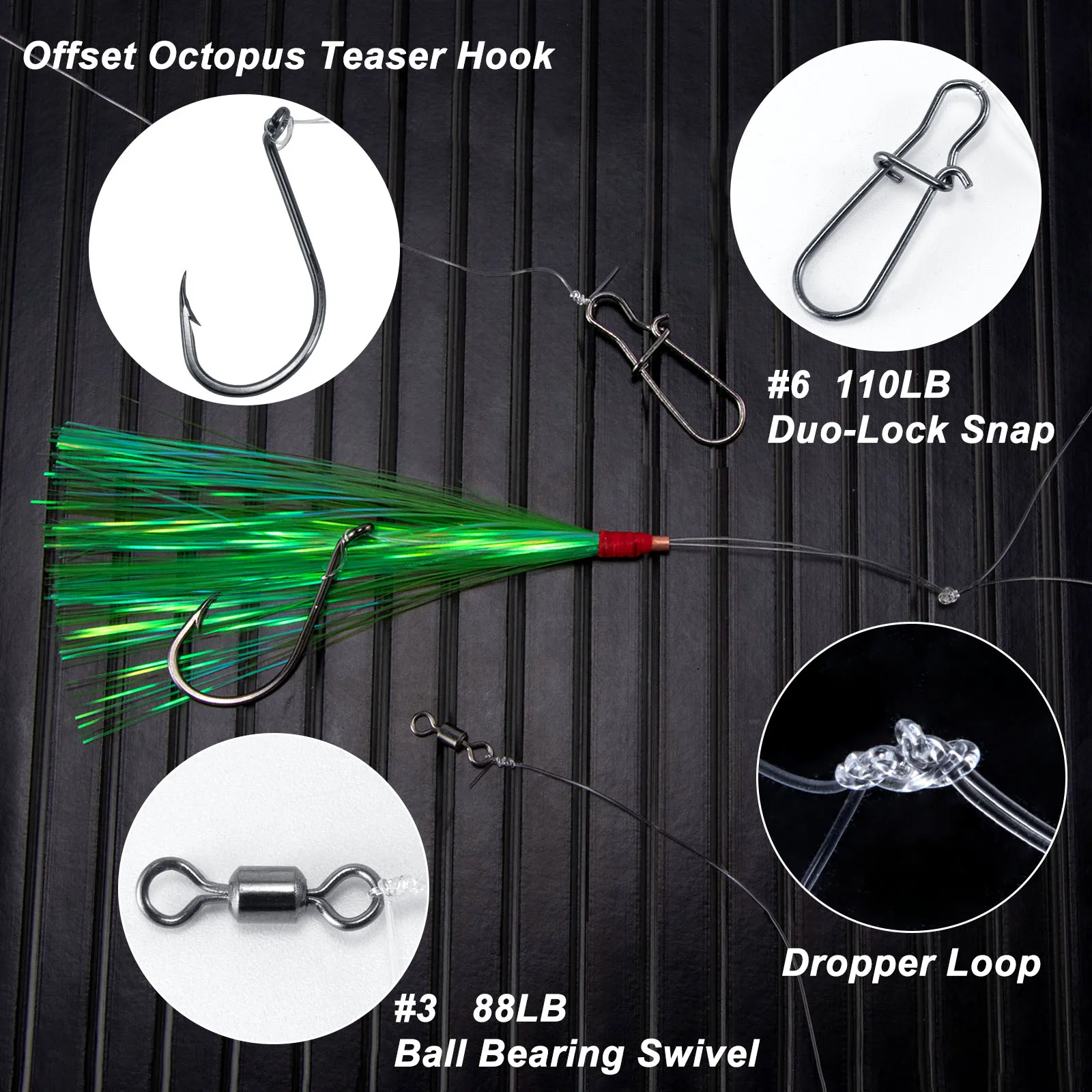 Los eslabones giratorios y los broches están hechos de acero inoxidable con níquel para que su aparejo sea fuerte y resistente al óxido para la pesca de surf. Los ganchos de pulpo afilados de acero con alto contenido de carbono aumentarán su enganche.