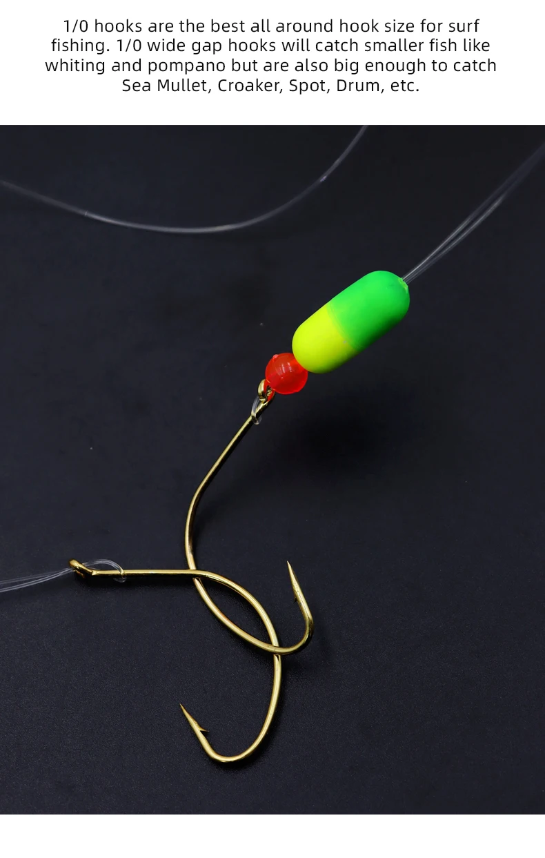 Los anzuelos 2.1/0 son el mejor tamaño de anzuelo para la pesca de surf. Los anzuelos de espacio ancho 1/0 pueden capturar peces más pequeños como bacalao y pompano, pero también son lo suficientemente grandes como para capturar salmonete marino, corvina, trucha moteada, pez roca y más.