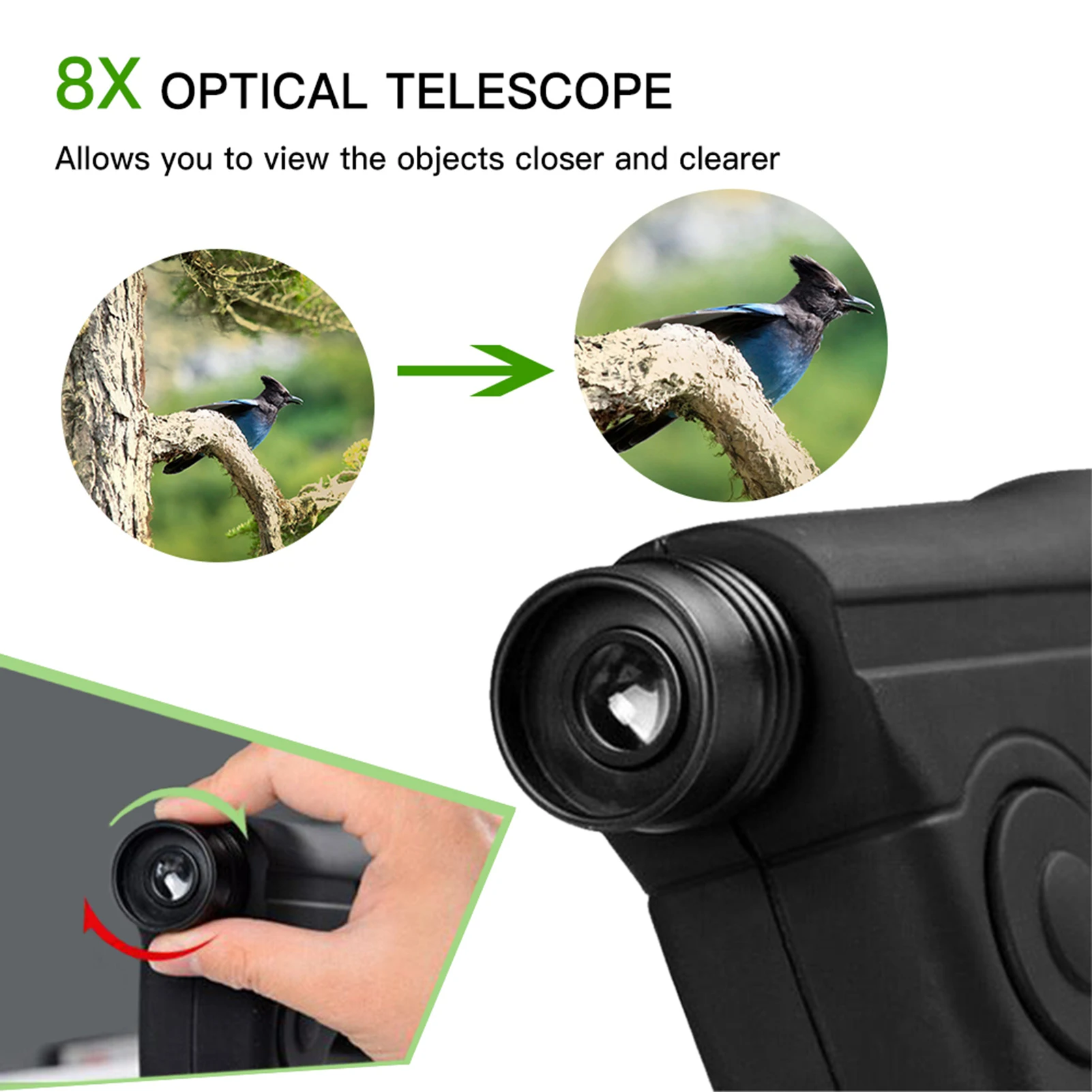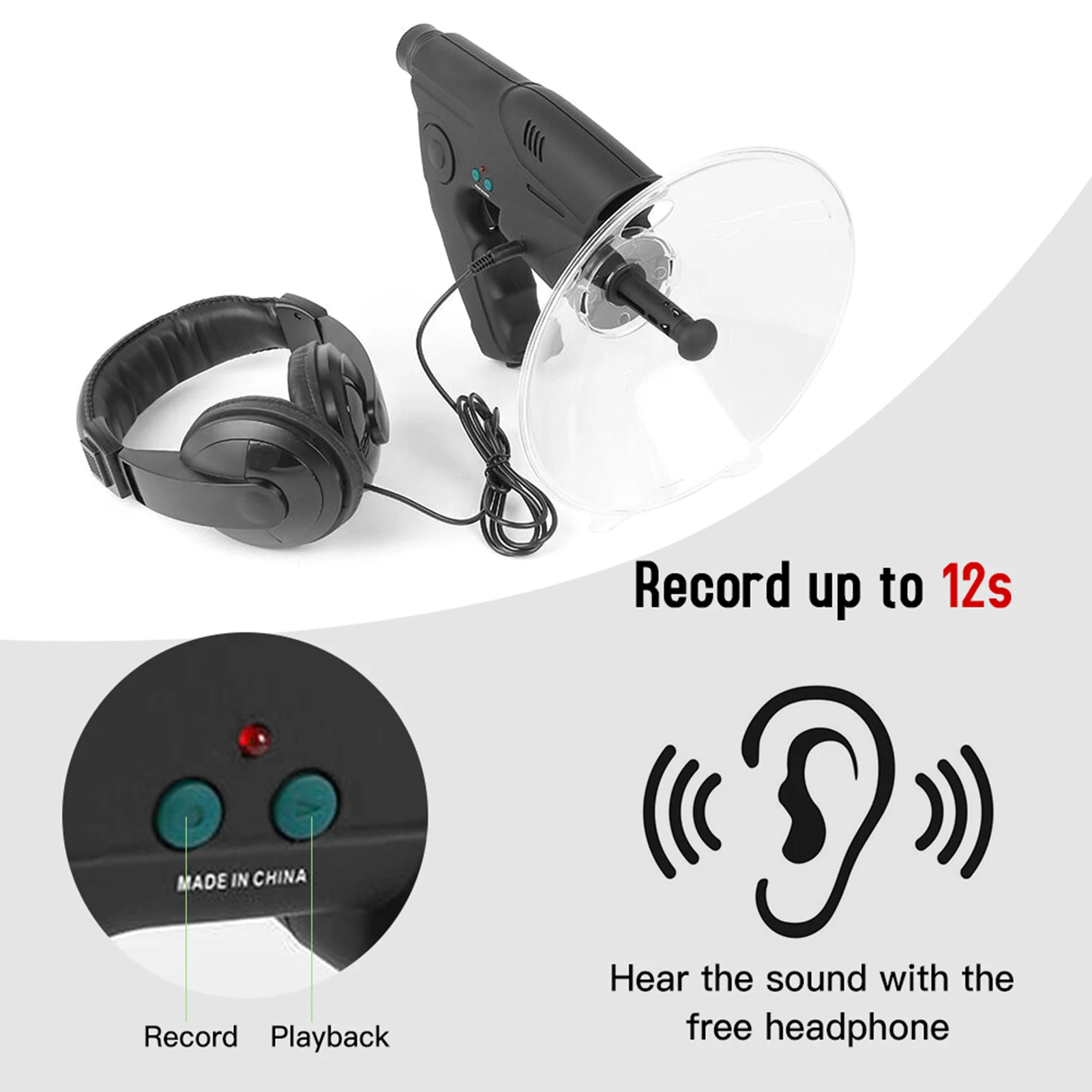 Esta es una herramienta ideal para observar y estudiar aves.Telescopio óptico 8x combinado con el selector de sonido, puede escuchar voces a una distancia de 100 metros y observar a los pájaros 8 veces más cerca.Un maravilloso dispositivo de escucha para actividades al aire libre.