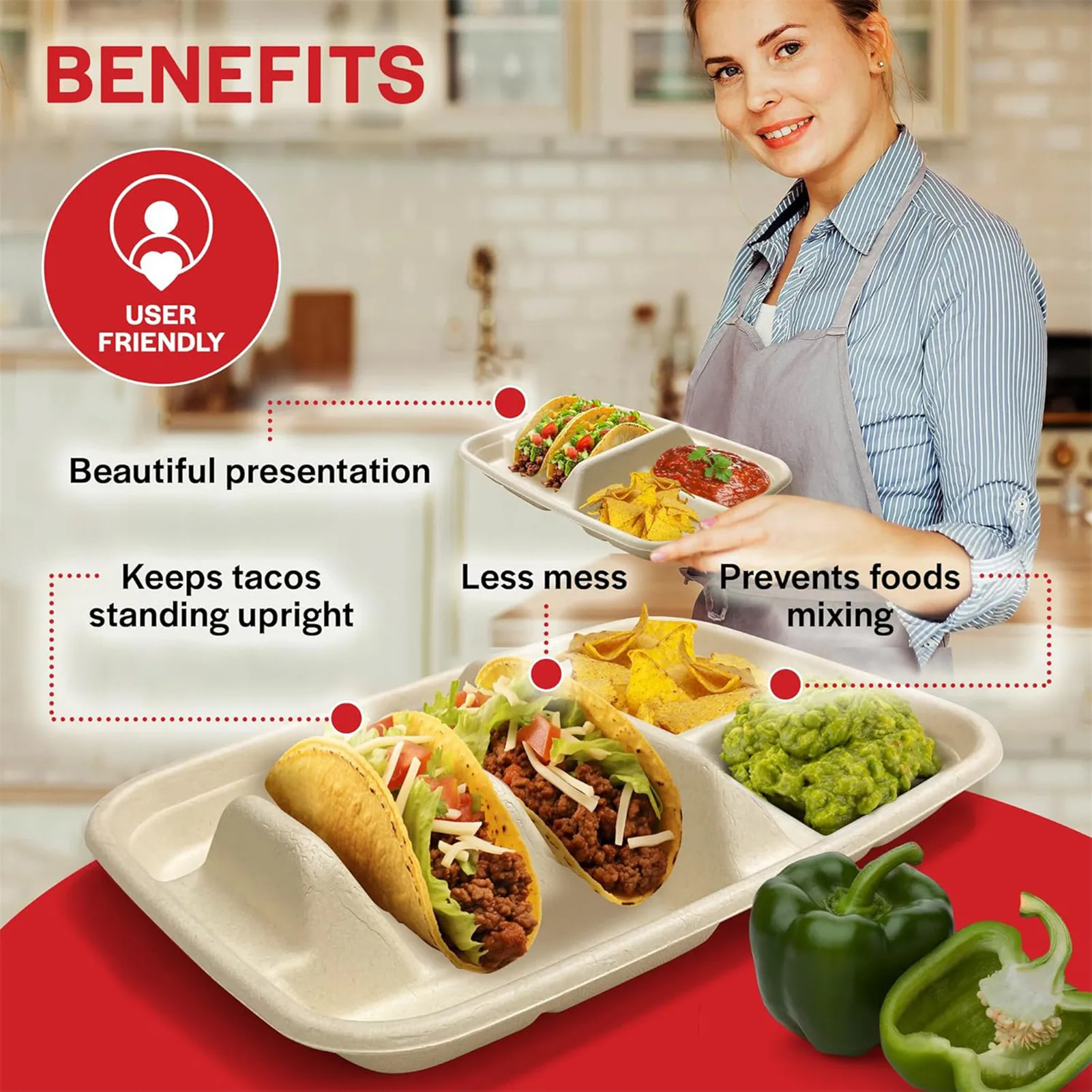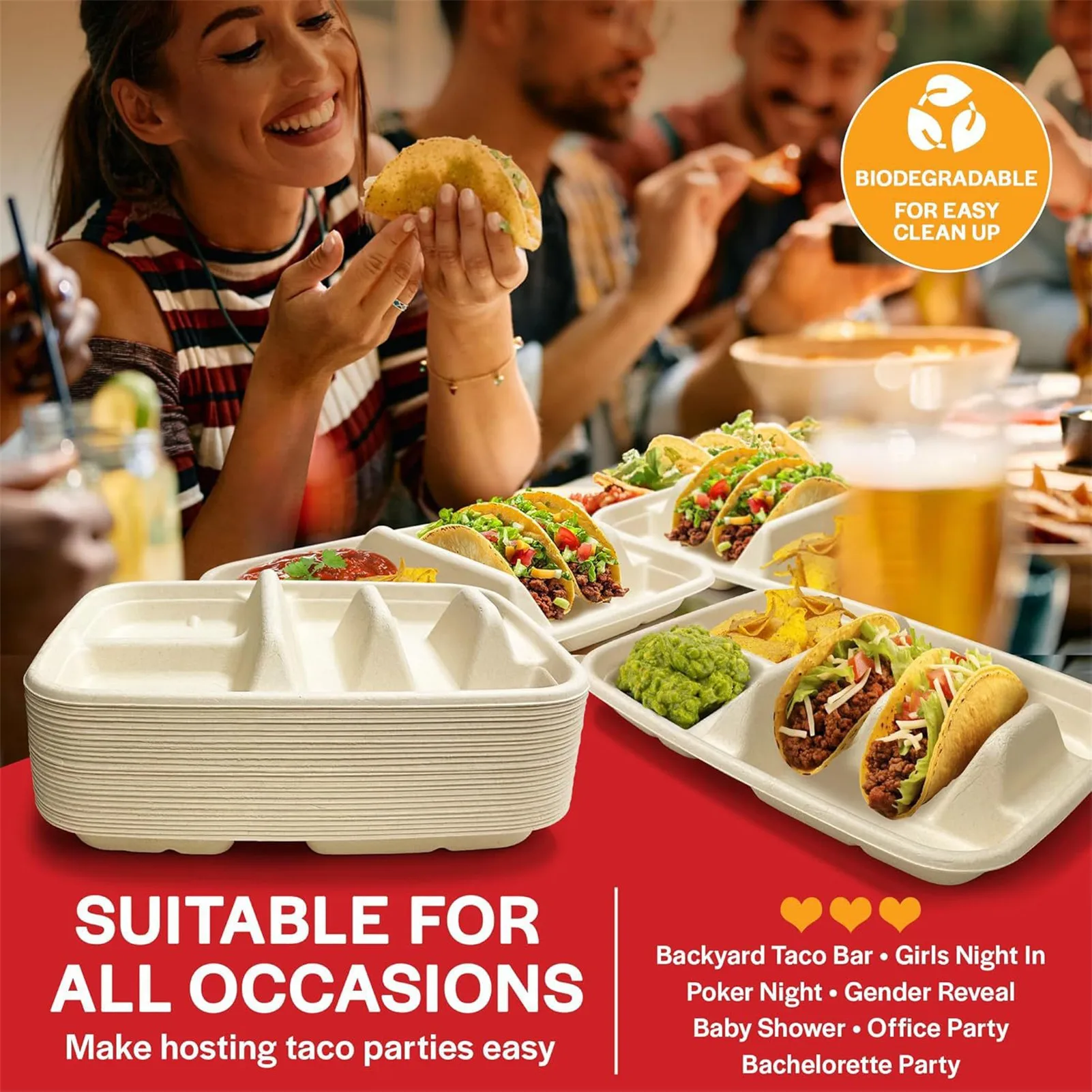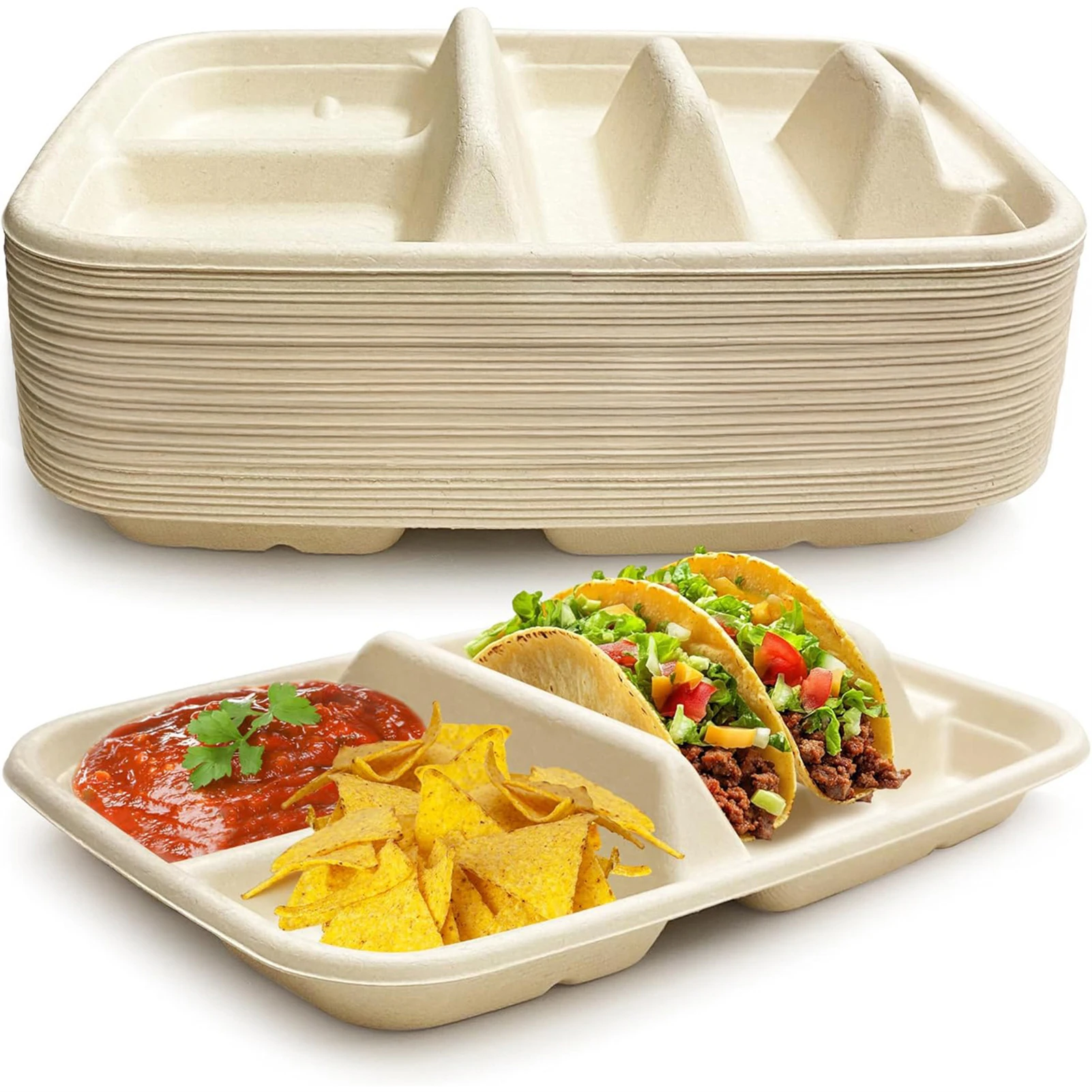 Gran capacidad y divisores: el soporte para tacos desechable de gran capacidad cuenta con divisores incorporados para mantener los tacos perfectamente separados, evitando derrames y lo que lo hace ideal para servir varios tacos sin esfuerzo durante fiestas o reuniones.
