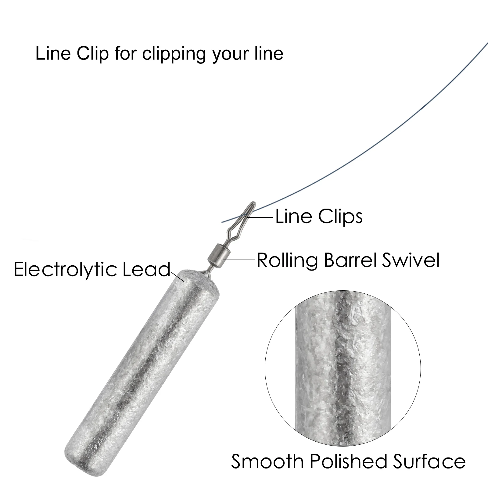 Viene con un clip de línea que permite a los pescadores cambiar el tamaño de su peso o la longitud de la guía sin tener que volver a atar.
