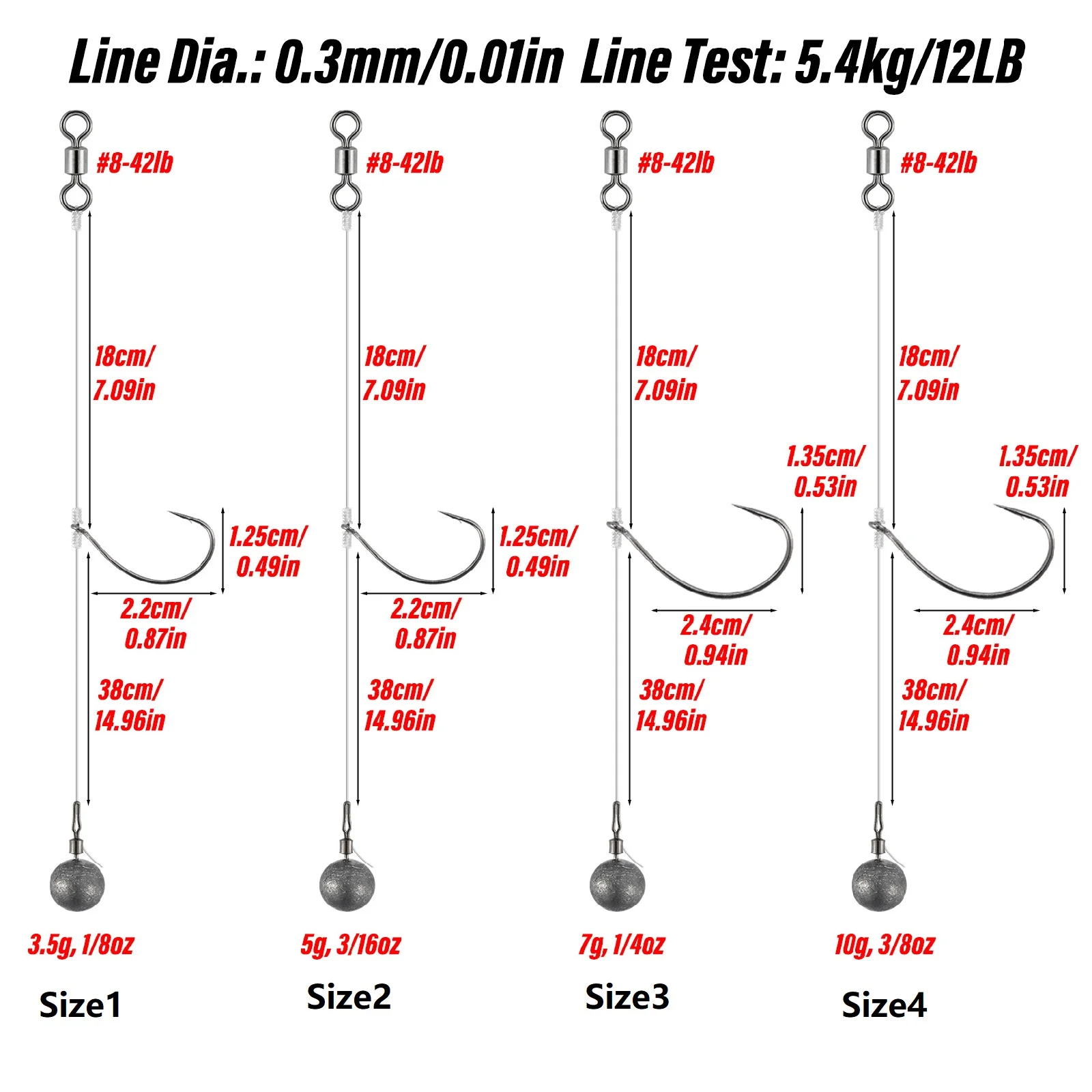 Paquete de 5 plataformas Drop Shot Ready en cada paquete. Pesos de Drog Shot disponibles: 1/8oz, 3/16oz, 1/4oz, 3/8oz. Tamaño de la línea, diámetro y prueba: #3-0,01 "-12lb. Tamaño de los ganchos: #1(1/4oz, 3/8oz), #2(1/8oz, 3/16OZ). Tamaño y prueba de los cilindros giratorios: # 8-42lb.