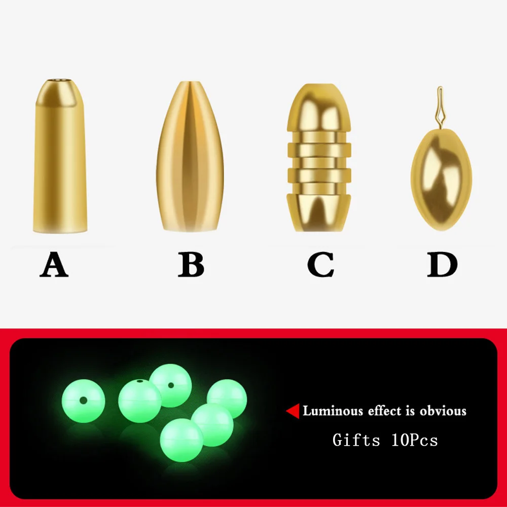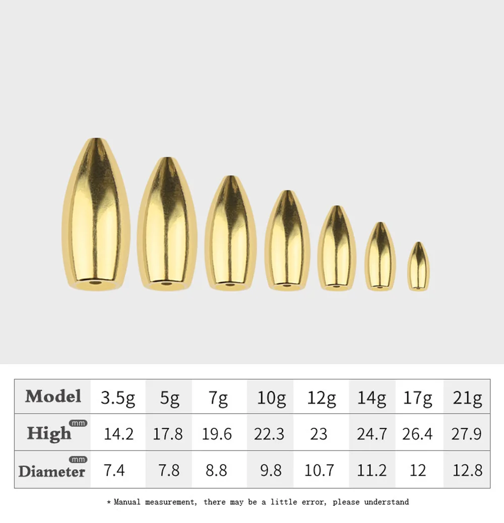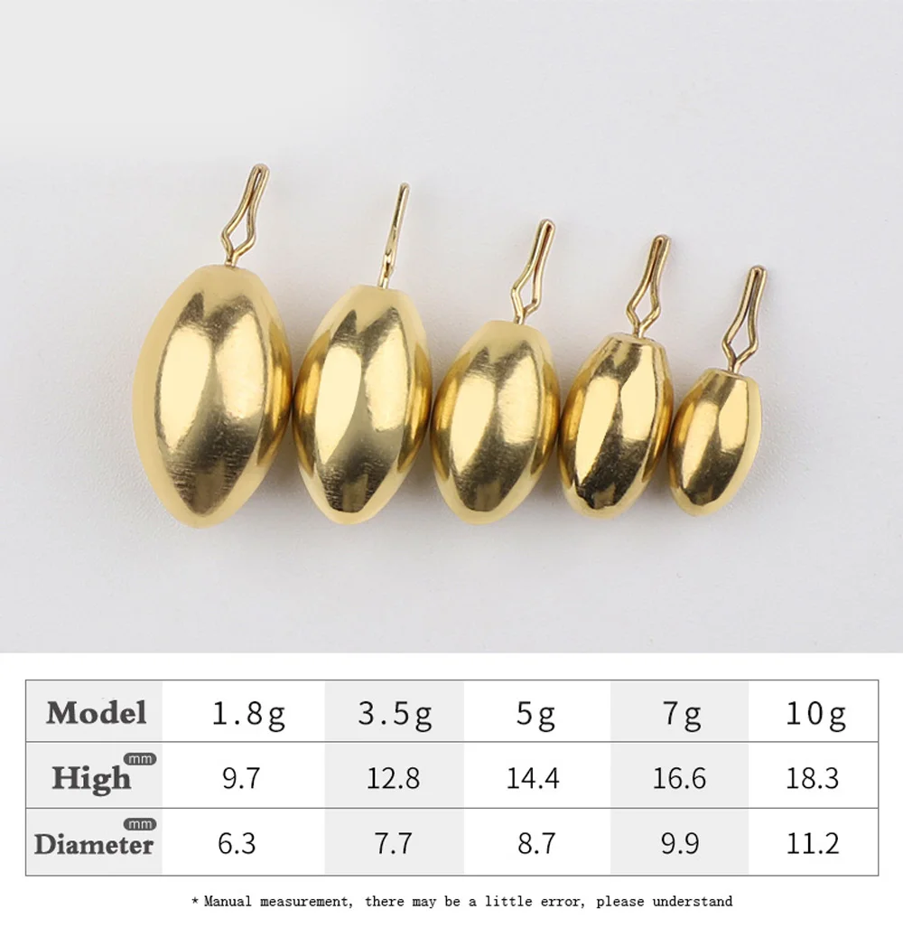 Plomo de pesca de peso de latón, accesorios de aparejos, plomo de cobre puro hacia abajo, pesas de rig de bala, cono de señuelo, línea hueca, 10 Uds.