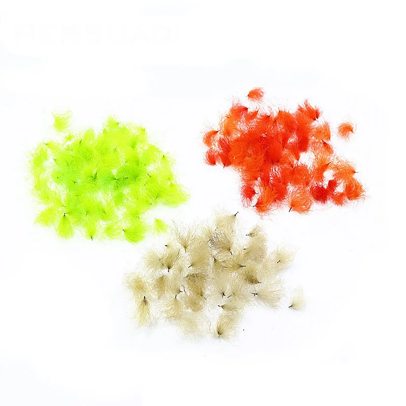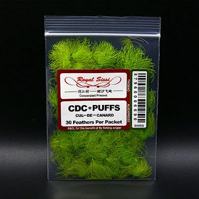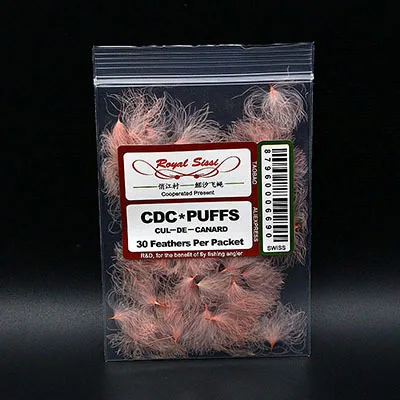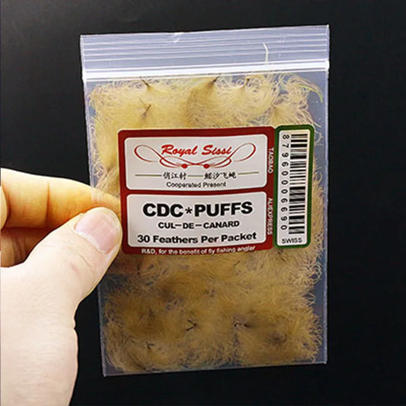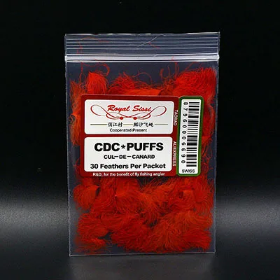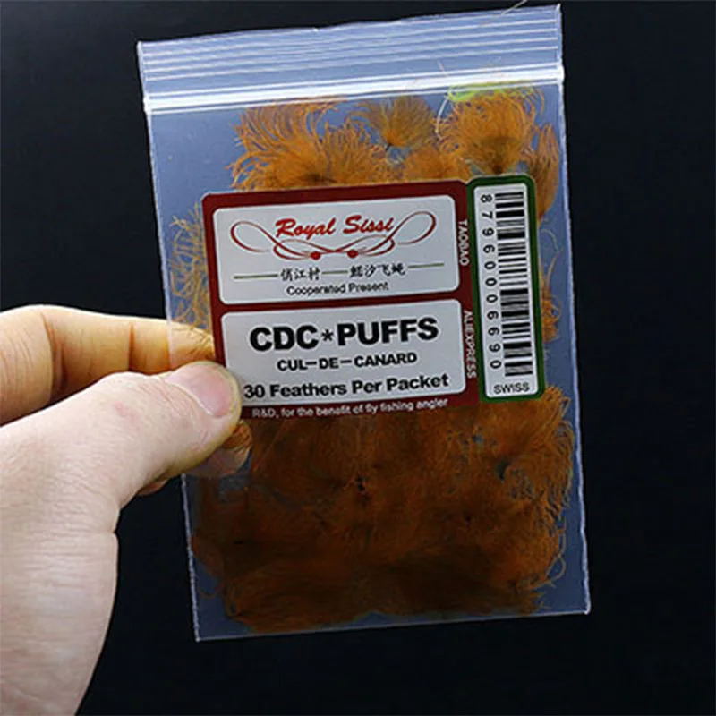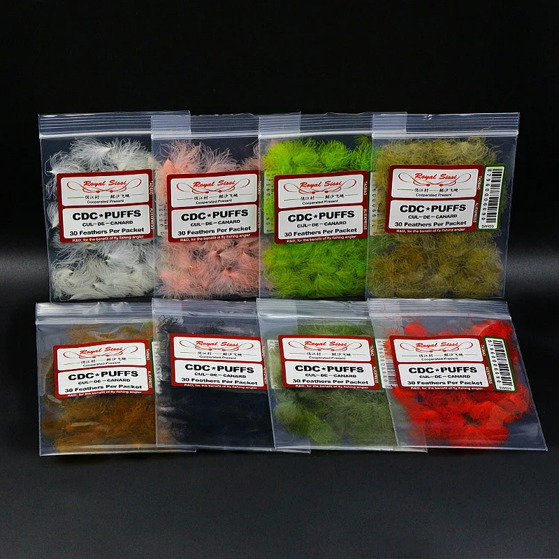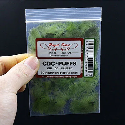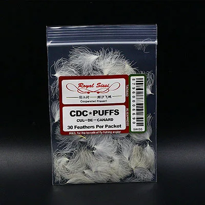 Características:Estas plumas cortas carecen de tallos discernibles y a menudo se llaman plumas de pezón porque en un pájaro vivo, se encuentran en el pezón de la glándula preen. Atadas como postes de ala, estas plumas esponjosas atrapan mucho aire. A menudo, la burbuja CDC Bubble está destinada a hacer flotar la mosca en la película de la superficie. En el patrón de mosquitos, la burbuja no está hecha para flotar la mosca. Solo es lo suficientemente grande como para llevar a la mosca a una posición vertical, ya que se hunde muy lentamente.