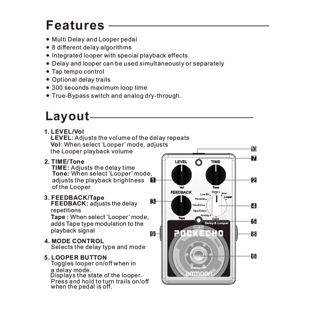 Pedal de retardo y Looper con 8 efectos de retardo (analógico/ECO de cinta/ECO de tubo/retroceso/BIT bajo/Galaxy/Mod), y el tiempo máximo de bucle es de 300s.