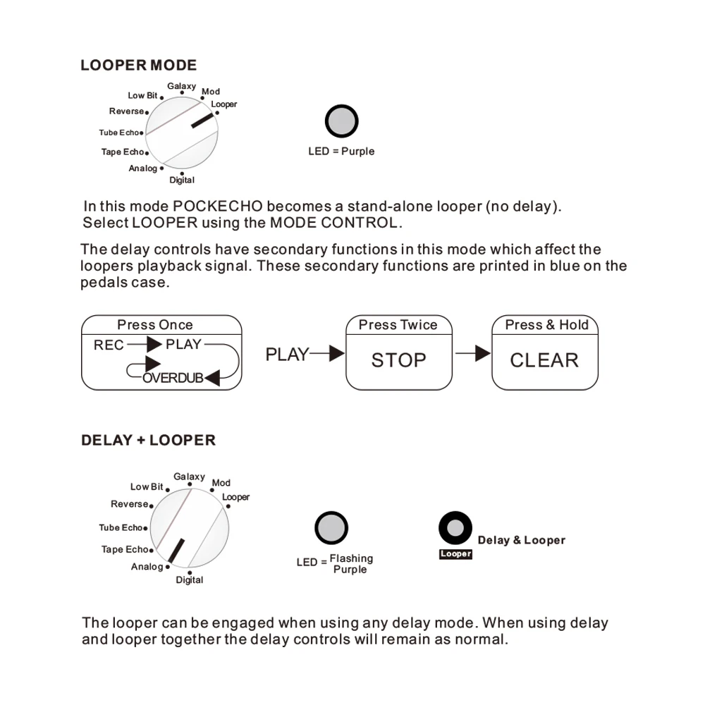 Looper se puede utilizar simultáneamente con un efecto de retardo, o en modo LOOPER como un Looper independiente con algunos efectos de reproducción especiales.