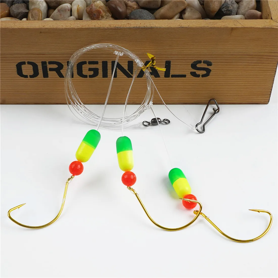 1. El Pompano Rig está atado con monofilamento y ganchos de separación ancha chapados en oro, un extremo está equipado con un eslabón giratorio #2, y el otro extremo está equipado con un broche #3 para el peso de la pesca de surf.