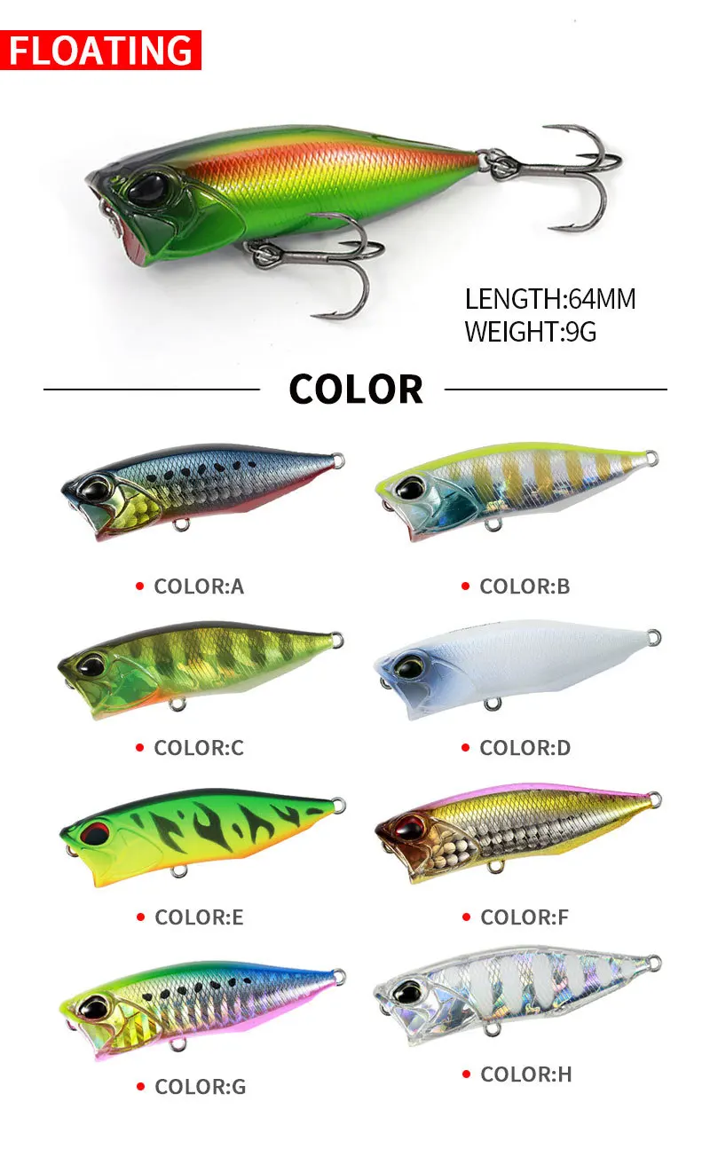 Popper-Señuelos de Pesca flotantes, cebo duro de 64mm, 9g, ojos 3D, Topwater, lubina, trucha, Lucio, Wobblers artificiales, aparejos de pesca de plástico