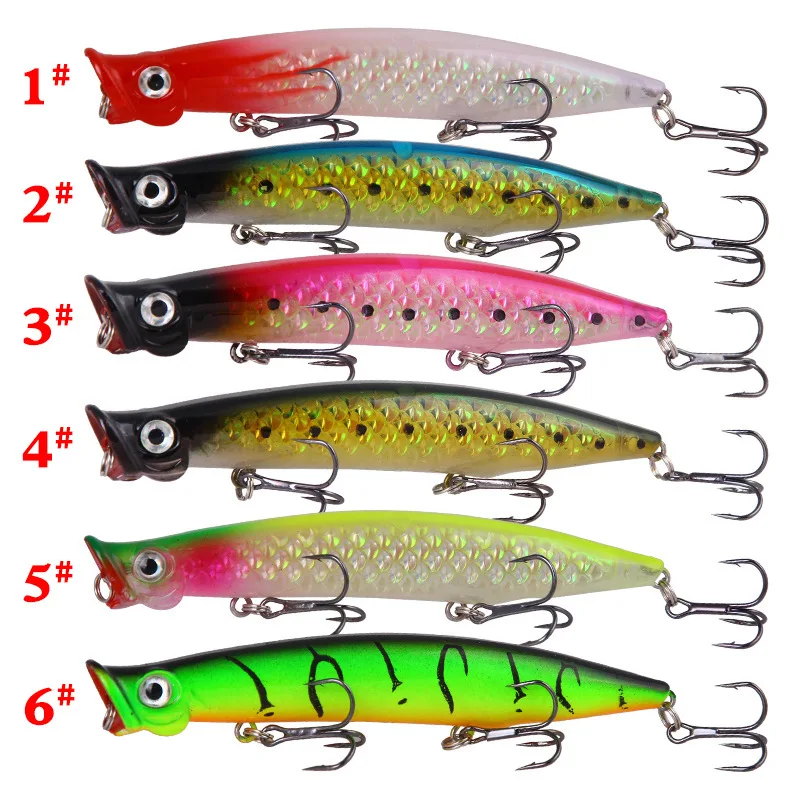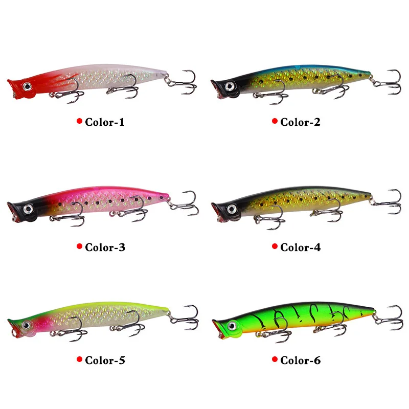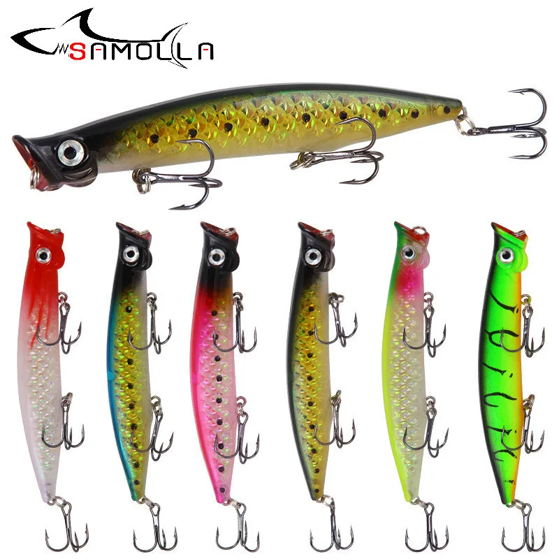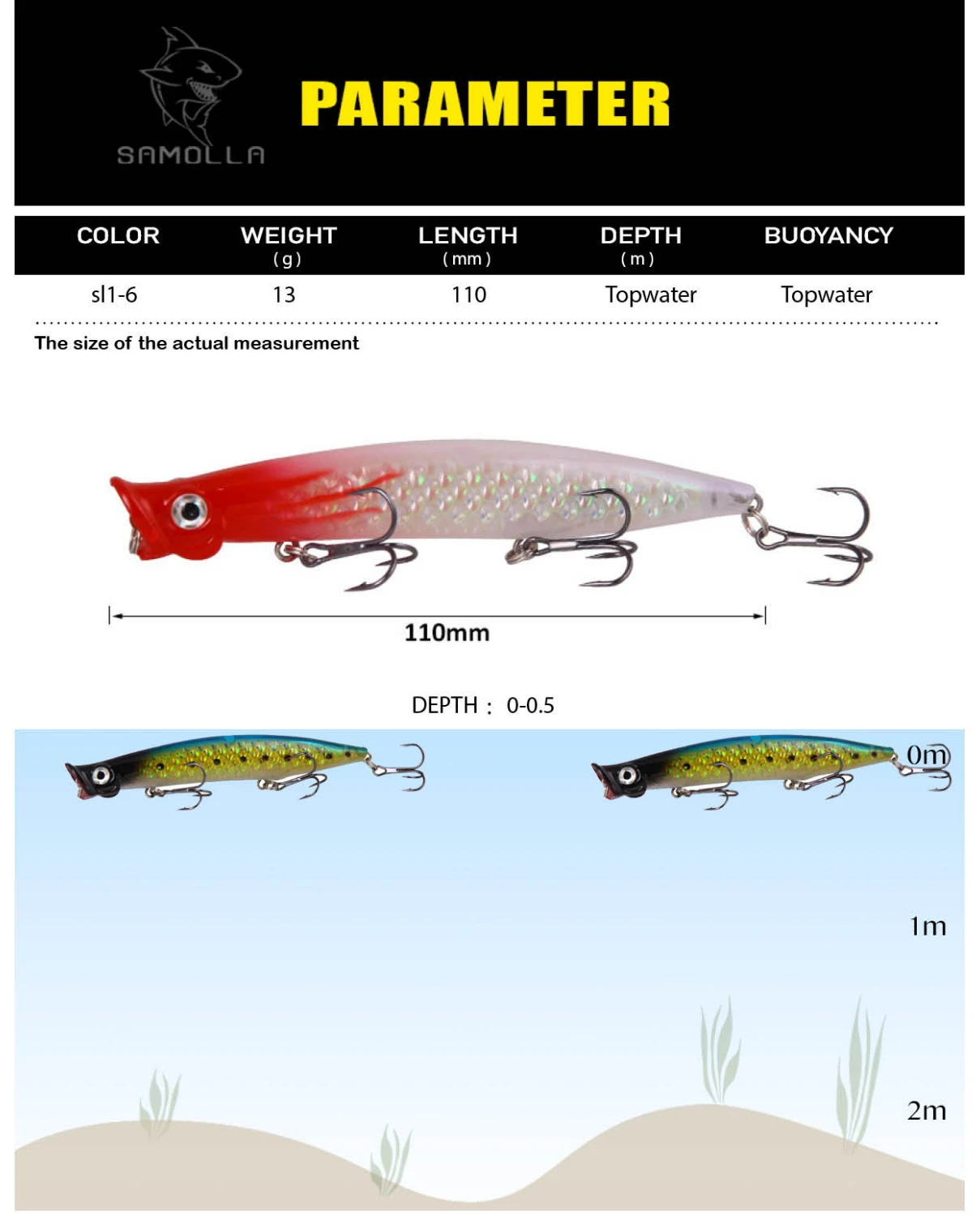 Detalles del producto: Marca: SAMOLLA Modelo de señuelo: Popper Tipo de señuelo: señuelo de pesca duro Peso del señuelo: 13G Longitud del señuelo: 110mm Profundidad buceo Flotabilidad: Topwater Ganchos: equipados con ganchos anticorrosión de la marca: Ojos: ojos de pez 3D Anillos: bicíclicos Colores: 5 colores