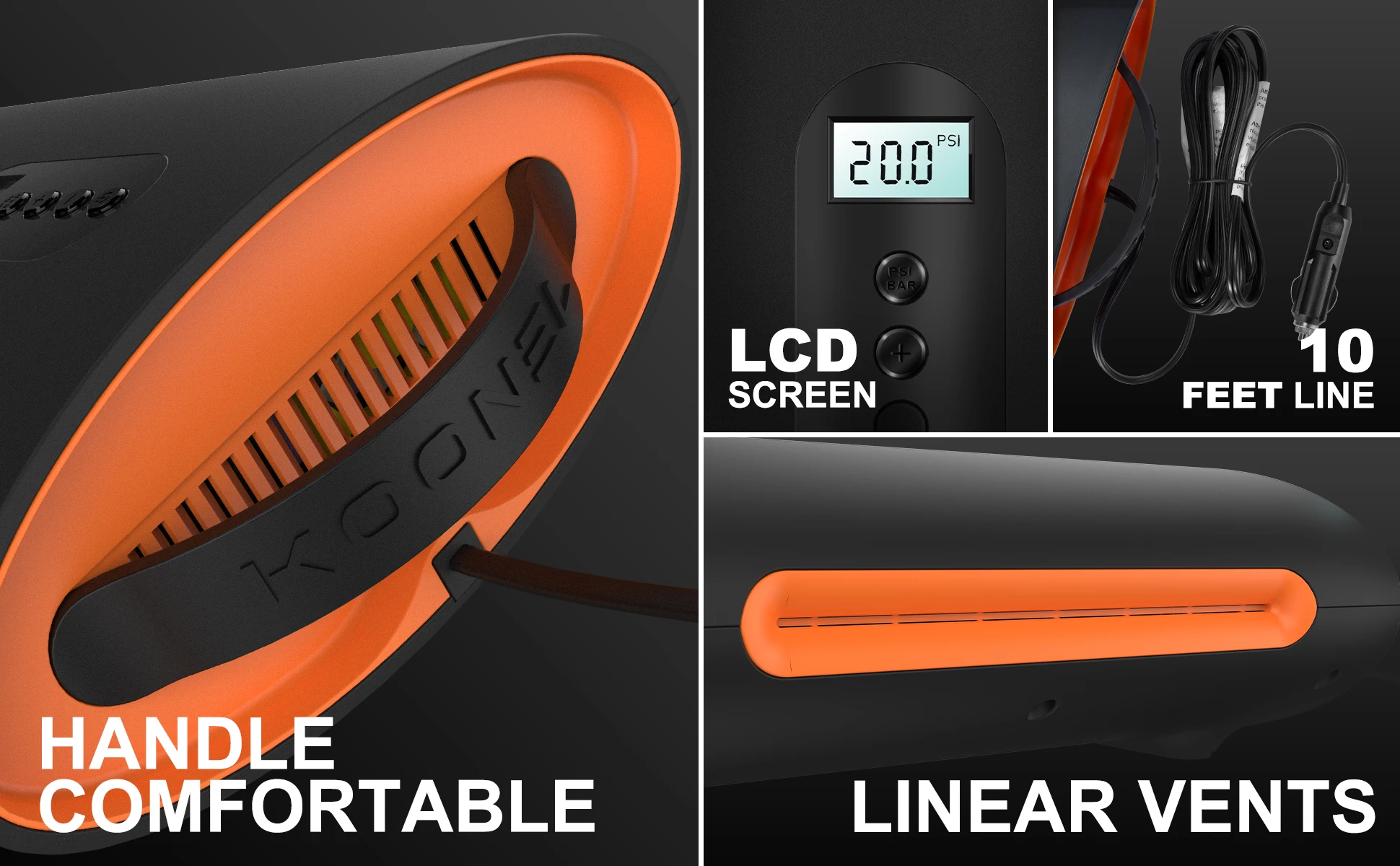 【Pantalla LCD y cable de 10 pies】La bomba de aire de 12 voltios KOONEL está equipada con pantalla LCD. Puede monitorizar continuamente los valores de presión con una precisión de 0,01 psi. Línea de 10 pies (unos 3 metros) para un acceso más fácil a los esquís fuera del coche