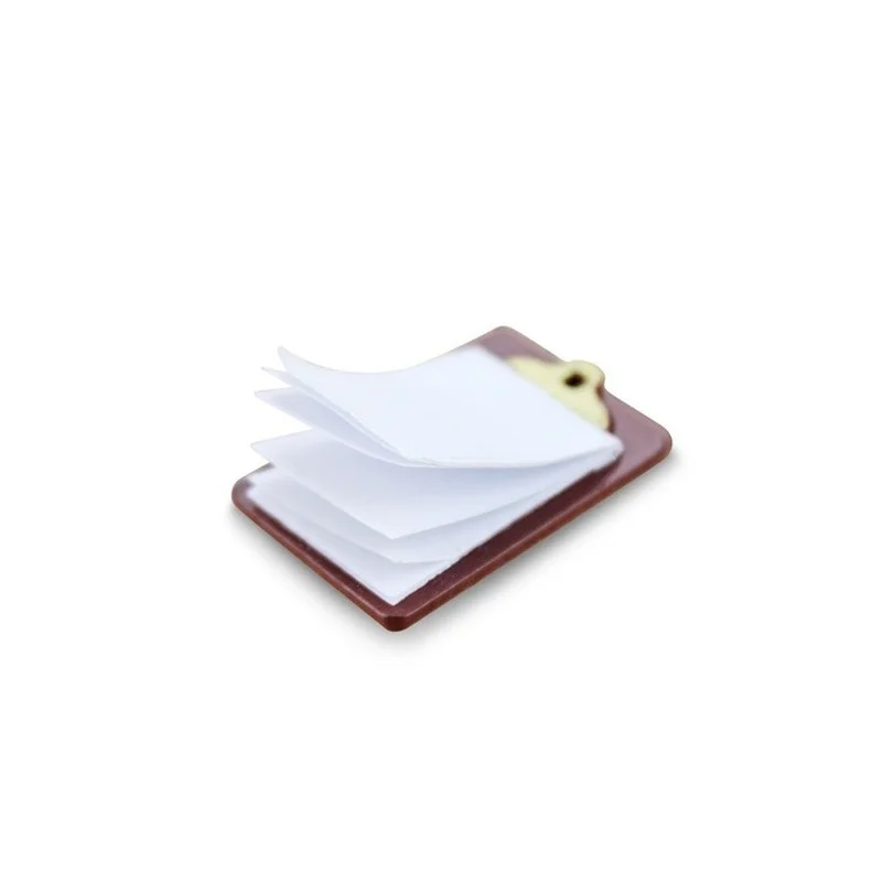 Un portapapeles en miniatura perfecto para casa de muñecas con un par de hojas de papel real adheridas.