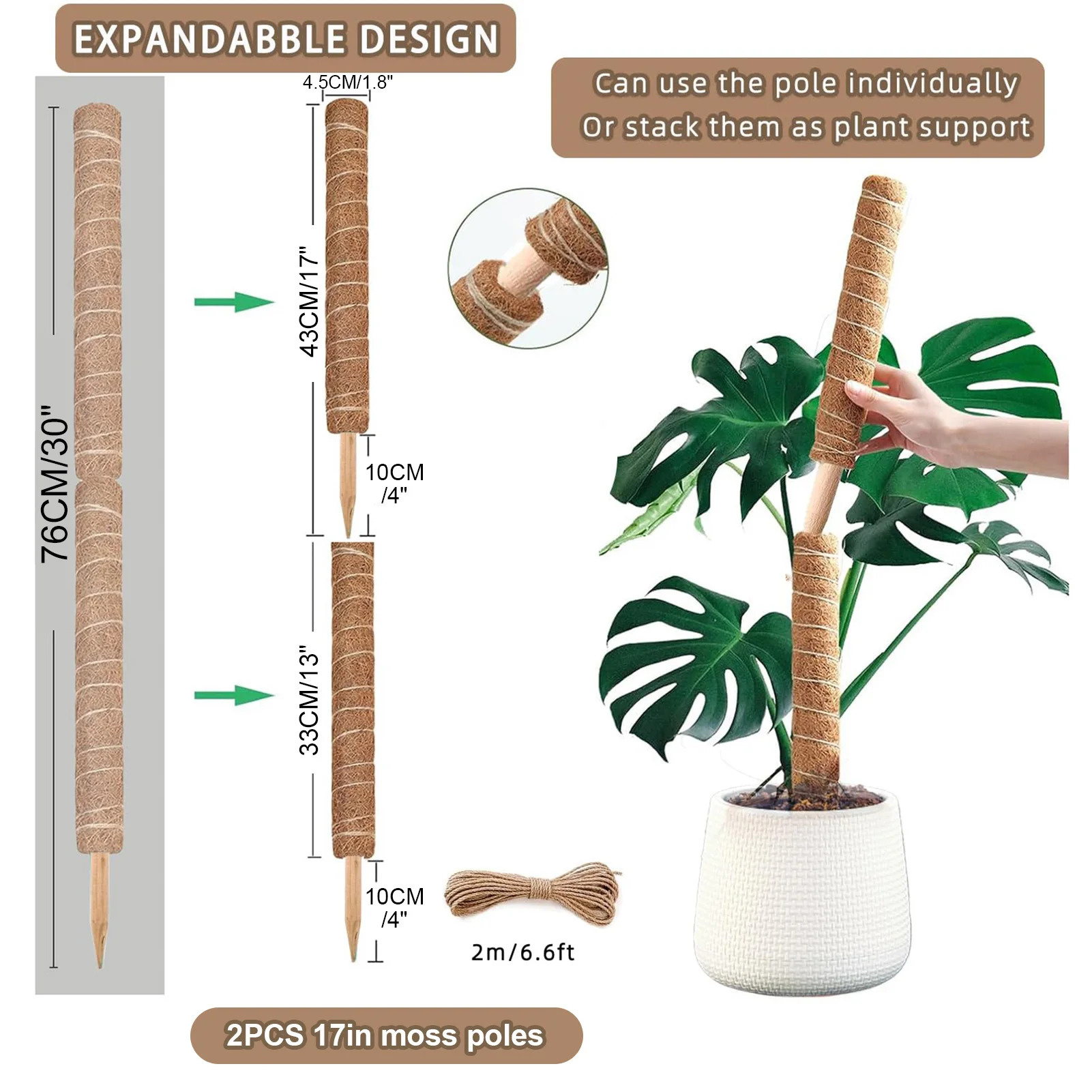 EXPANDIBLE: diseño extensible, se puede usar solo al principio, a medida que la planta crece, las hojas serán más hermosas y llenas, luego puede apilar los postes para aumentar la altura de la planta, evitando eficazmente daños a las plantas en macetas debido a Reemplazo de postes de musgo.