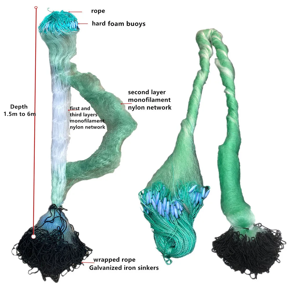 Red flotante de 3 capas, se usa en ríos, lagos, embalses, estanques, etc. La plomada de cuerda puede enredar hormigas, no es fácil ensuciar, incluso si la red está desordenada, ¡es fácil de clasificar!