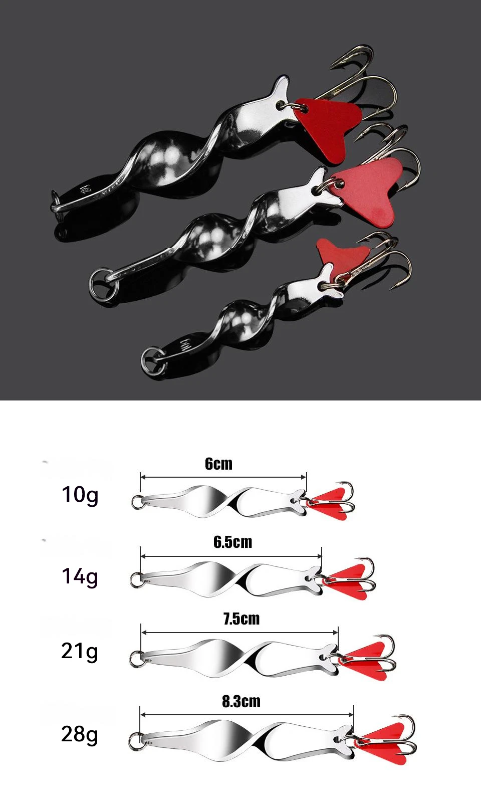 Nombre: Lentejuelas en espiralEspecificaciones: 10g, 14g, 21g, 28GDimensiones: 6cm, 6,5 cm, 7,5 cm, 8,3 cmMaterial: MetalLanzamiento: 50-90 metrosEmbalaje: a granel
