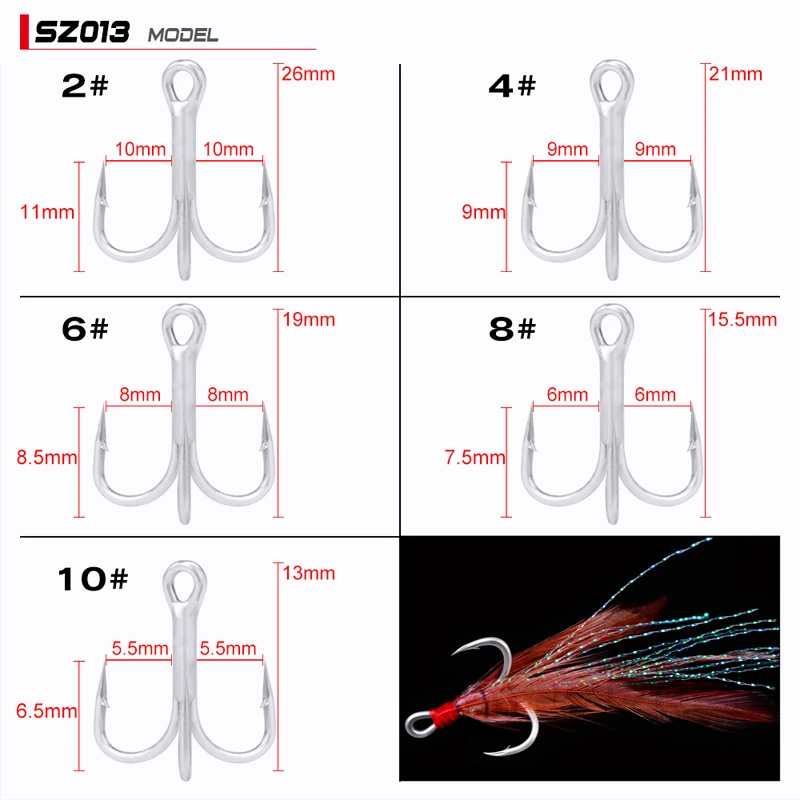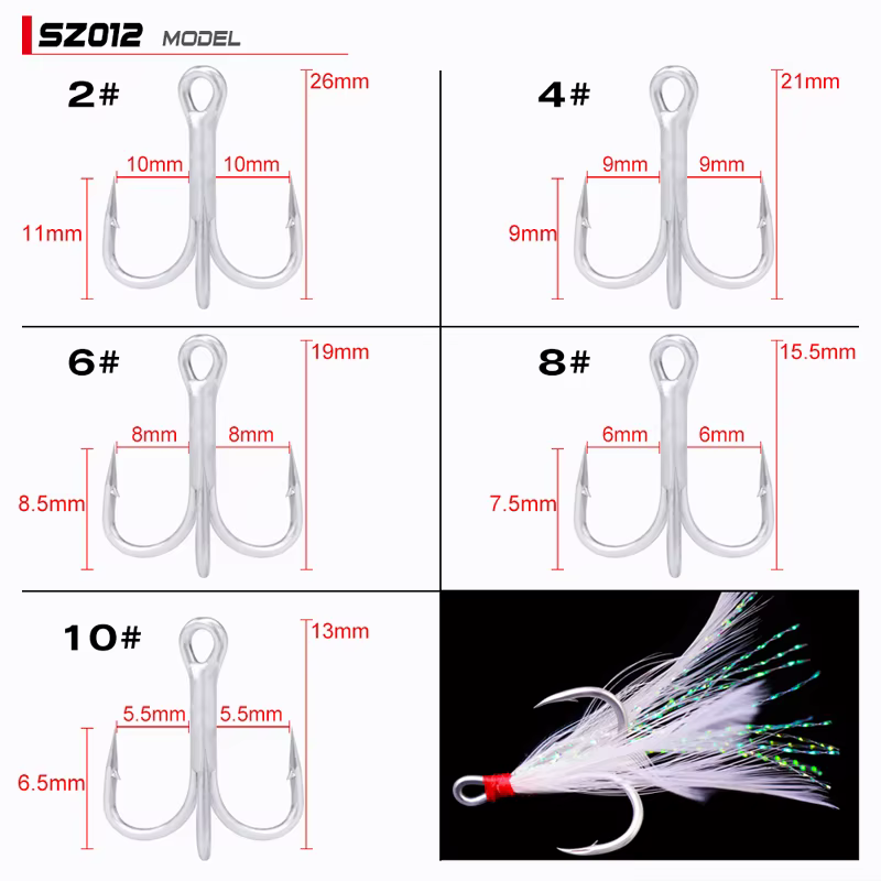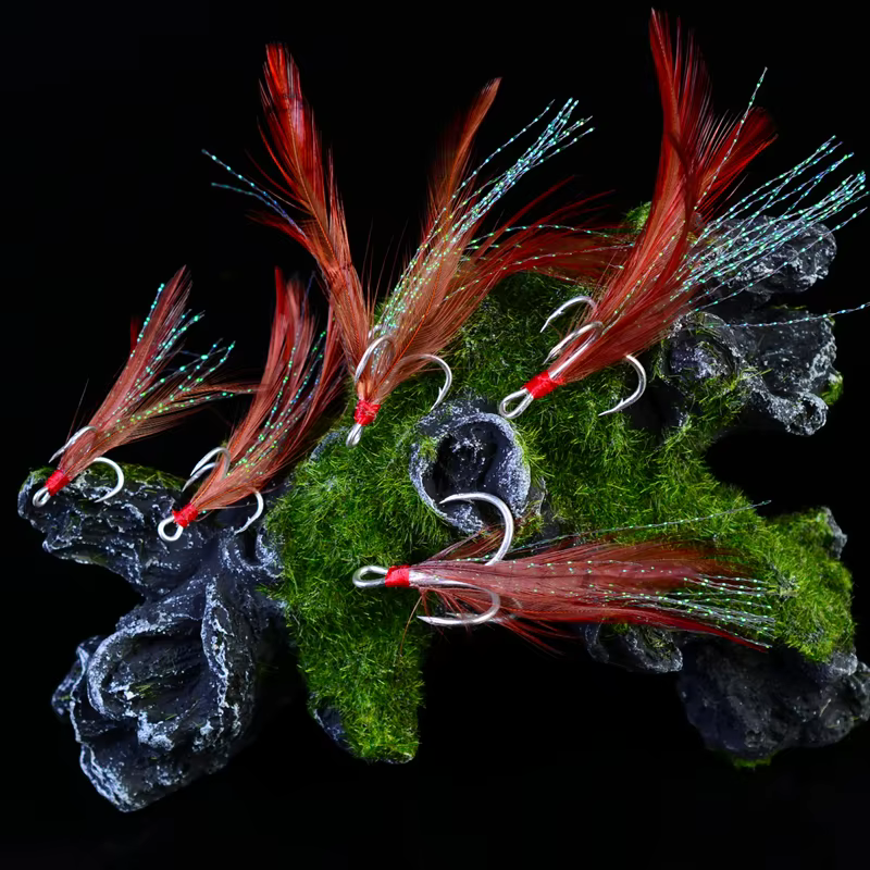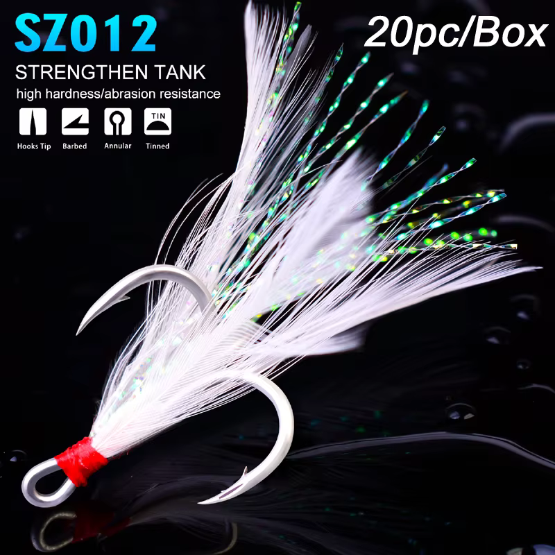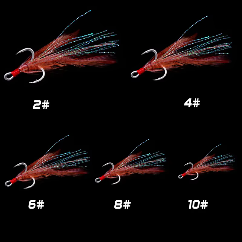 PROBEROS 20 pzas/lote anzuelos de pesca de plumas 2#-4#-6#-8#-10# Anzuelos triples de acero con alto contenido de carbono con anzuelos de plumas, aparejos de pesca