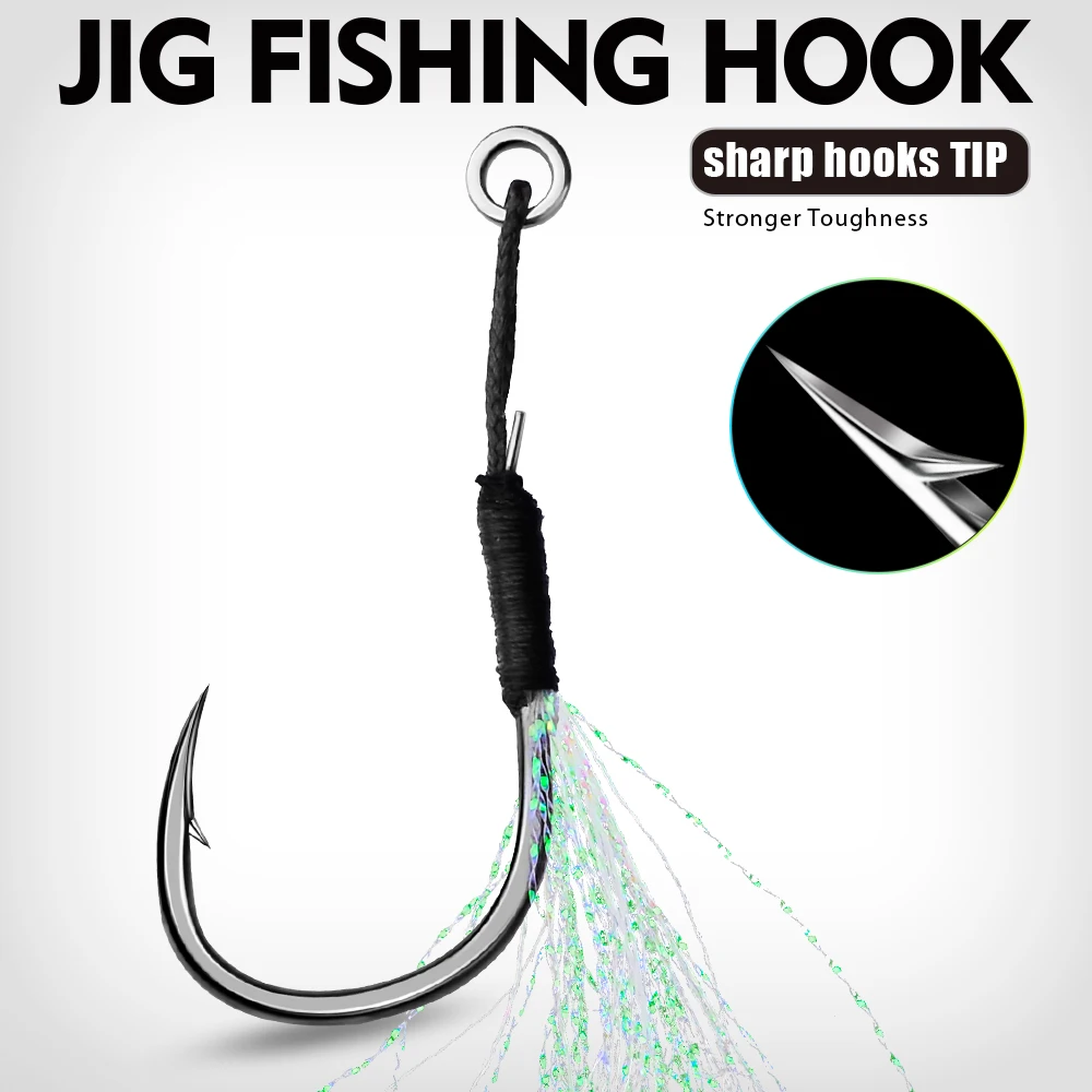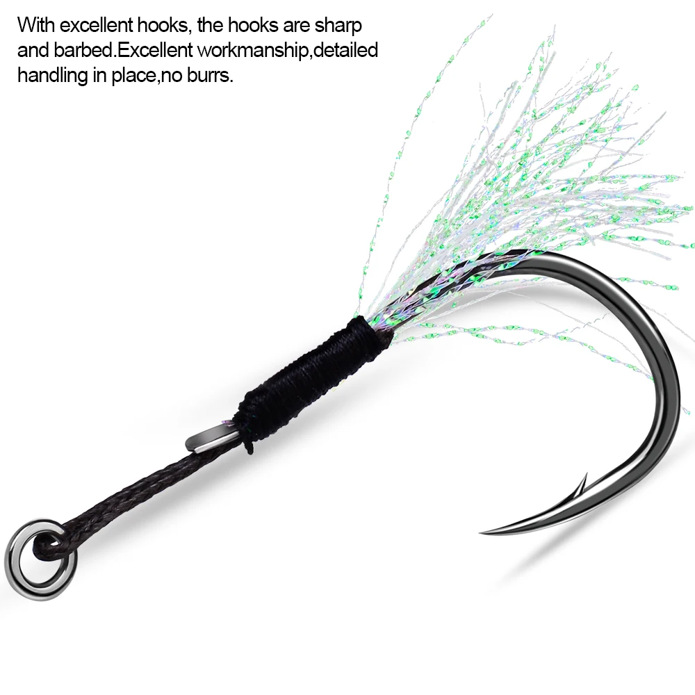 PROBEROS 100 piezas de ganchos de ayuda de luz UV de plantilla de Metal 11-19 # anzuelos de cuchara Jigging con línea de PE, ganchos de pesca de anillo sólido de pluma