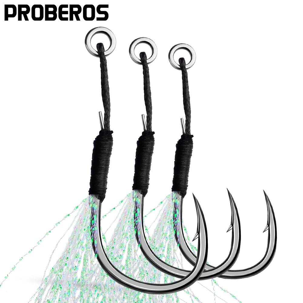 PROBEROS 100 piezas de ganchos de ayuda de luz UV de plantilla de Metal 11-19 # anzuelos de cuchara Jigging con línea de PE, ganchos de pesca de anillo sólido de pluma
