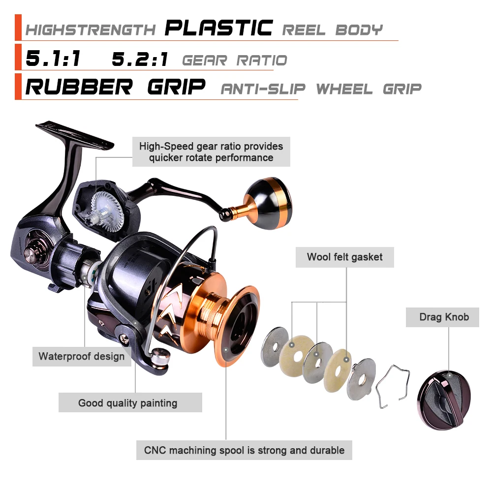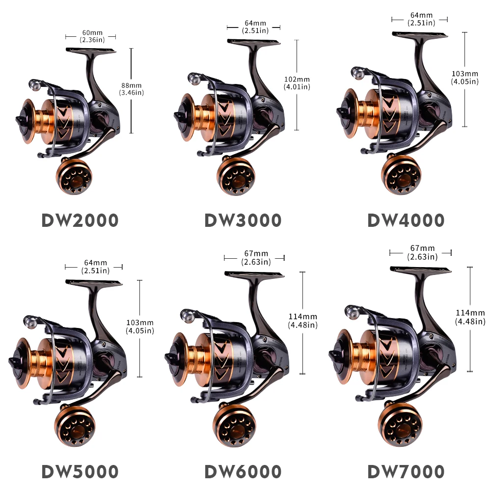 Serie: 2000-3000-4000-5000-6000-7000 Arrastre máximo: 11-13-15-17-19-21KG Peso neto: 220-286-300-313-413-434g Relación de engranajes: Serie 2000/3000: 5,1: 1 4000/5000/6000/7000Serie: 5,2: 1 Capacidad de la línea de la serie 2000 (mm/m): 0,15/200 0,2/150 Capacidad de línea serie 3000 (mm/m): 0,15/220 0,18/200 0,2/180 Capacidad de línea serie 4000 (mm/m): 0,2/300 0,25/195 0,3/135 Capacidad de línea serie 5000 (mm/m): 0,25/255 0,3/155 0,35/115 Capacidad de línea serie 6000 (MM/M): 0,3/170 0,35/125 0,4/100 Capacidad de línea serie 7000 (mm/m): 0,28/270 0,33/200 0,35/180 Características del producto: 1. Hasta 39,6 lb/21kg de arrastre de fibra de carbono de triple disco suave y fiable 2. Eje principal de acero inoxidable y engranajes de piñón de metal de manganeso de malla de precisión más fuerte 3. La serie tiene un diseño único de protección resistente al agua para su carrete, cuerpo y rotor. 4. Carrete de metal CNC único 5. Bloqueo instantáneo anti-retroceso, hardware de alta calidad, mango de metal completo Potente y fiable * Carrete de metal * Mango de metal completo * Cuerpo de grafito reforzado * Rotor de grafito reforzado