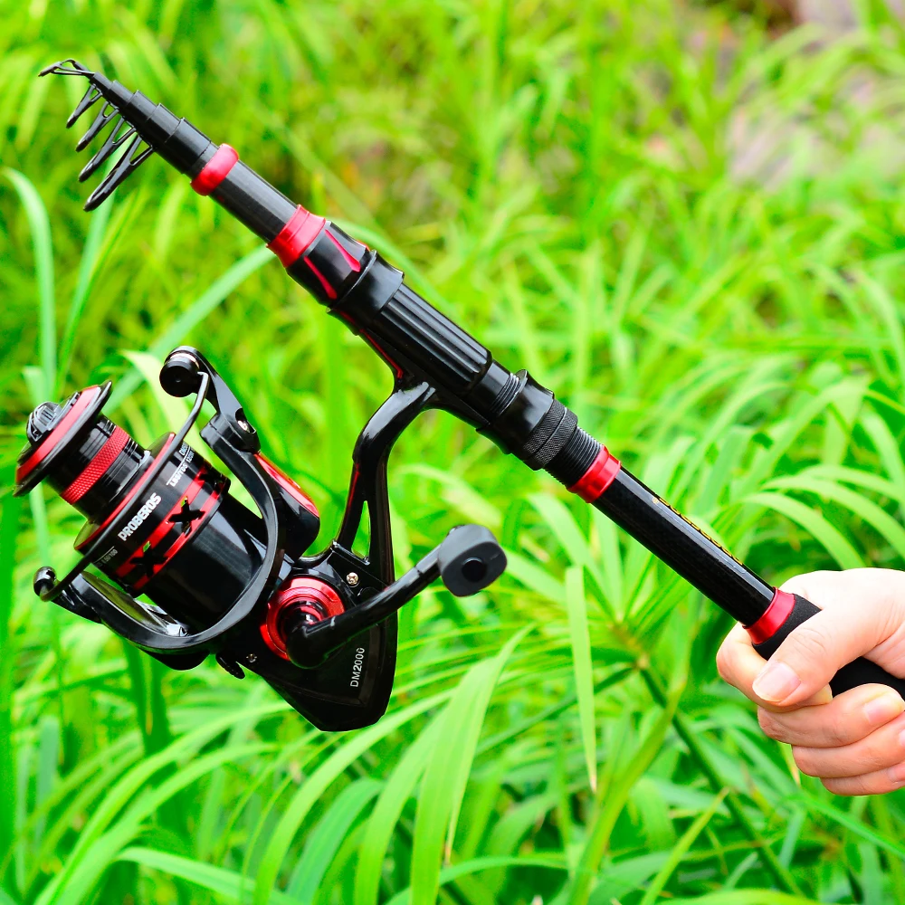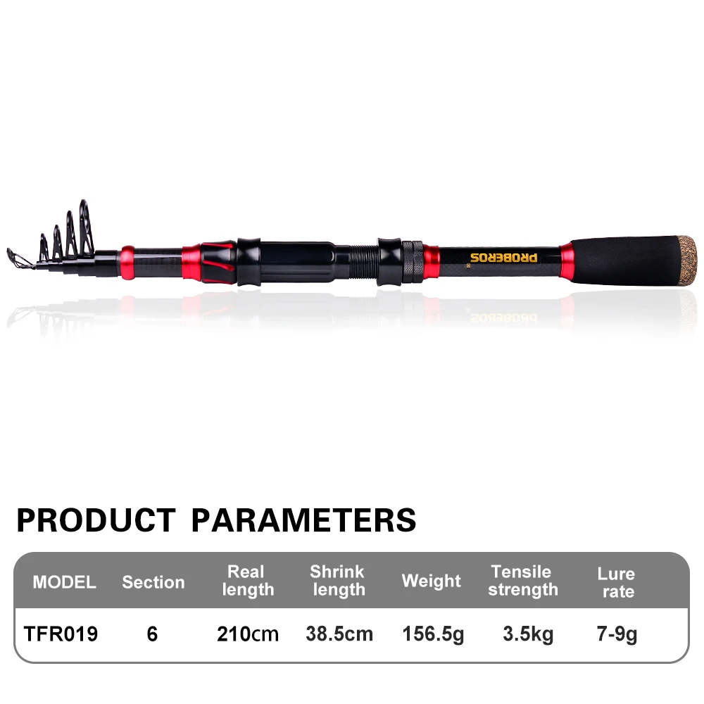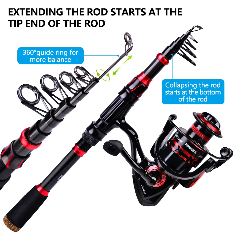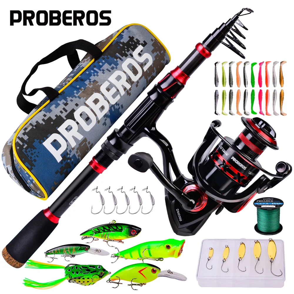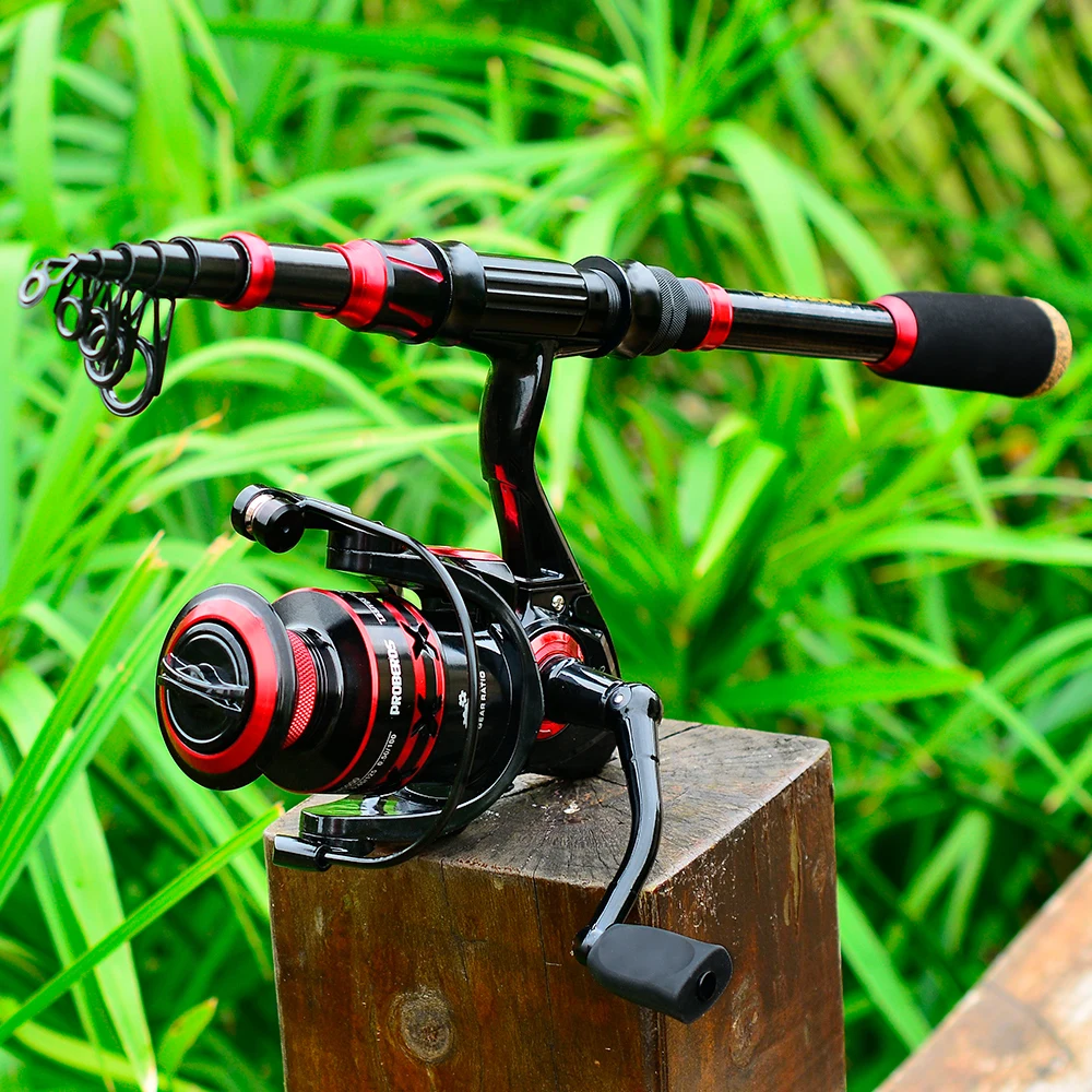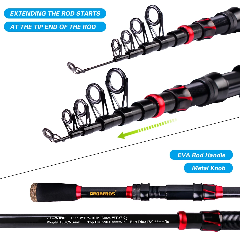 Kit de carrete y varilla telescópica Proberos 5,2: 1 carrete giratorio de relación de engranaje 2,1 m caña de pescar de fibra de carbono conjunto de ganchos de línea de cebos