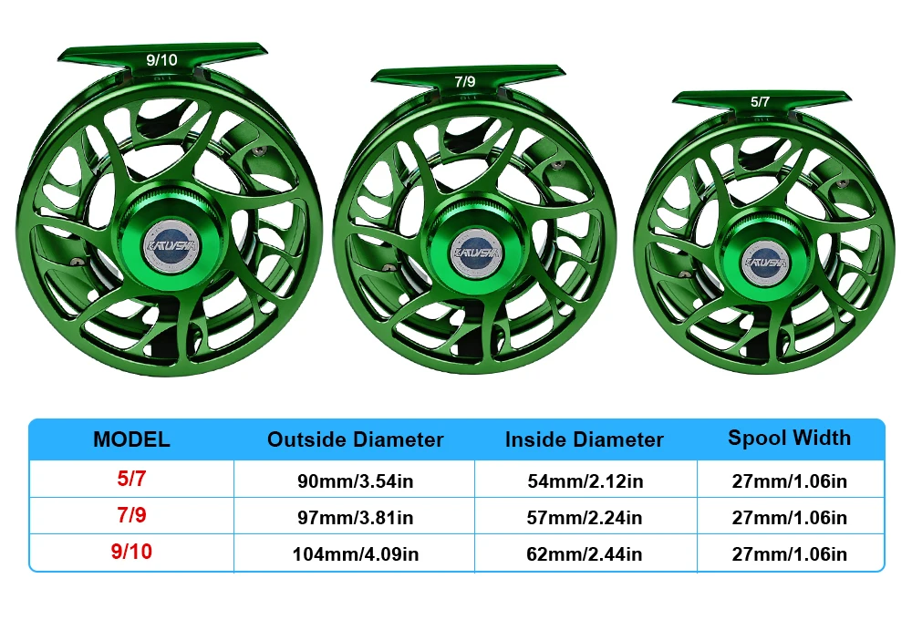 5/7 7/9 9/10 WT 3 + 1 BB rueda de pesca con mosca Color verde carrete de pesca con mosca CNC corte de máquina cenador grande fundición a presión carrete de mosca de aluminio