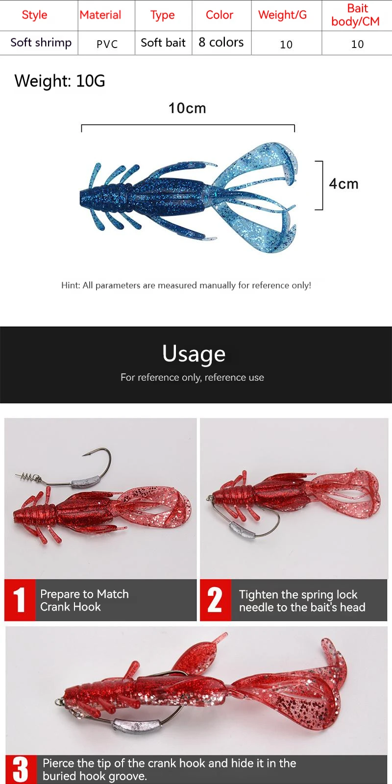 Nombre: camarón blando multibarbudo de doble colorTamaño: aproximadamente 10cmPeso: aproximadamente 10gMaterial básico: PVCTipo de Cebo: cebo blando LuyaEmbalaje predeterminado: a granel