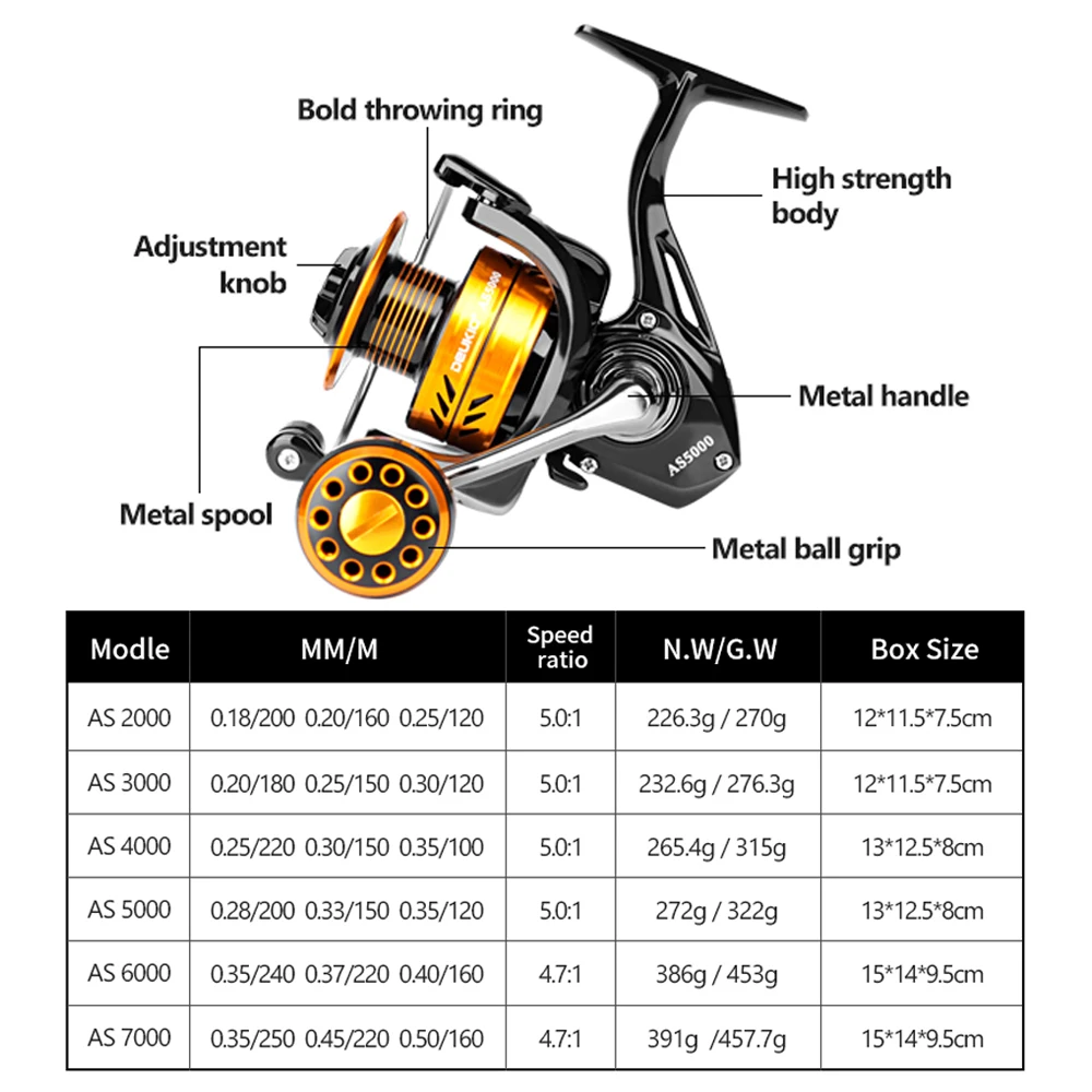 AS 5000 | Relación de engranajes: 5,0: 1 | Peso: 272,0g | Resistencia máxima: 10KG | Capacidad de Línea: 0,28-200 0,33-150 0,35-120