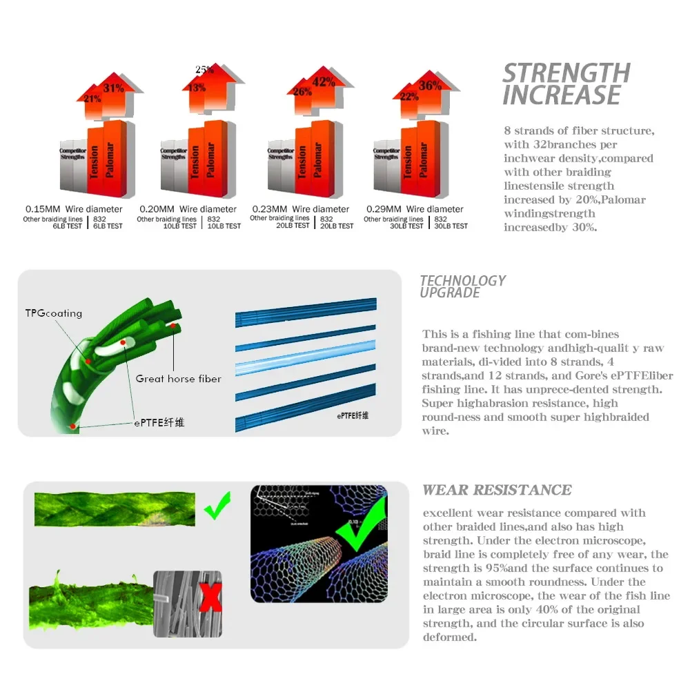 Línea de PE de 8 hebras, material de Japón, construcción trenzada única, hecha de fibras de PE de ultra alta resistencia