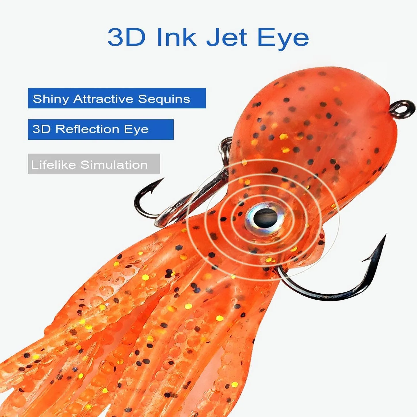3. Bucles y anzuelos dobles: los anzuelos de púas individuales de alta calidad y los anzuelos triples están conectados a la cabeza para aumentar la tasa de captura de su pez objetivo. El lazo adicional en la parte superior del cebo de pulpo se puede conectar a otro gancho con una cabeza a presión.