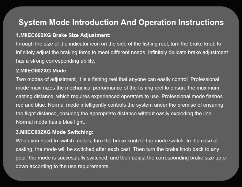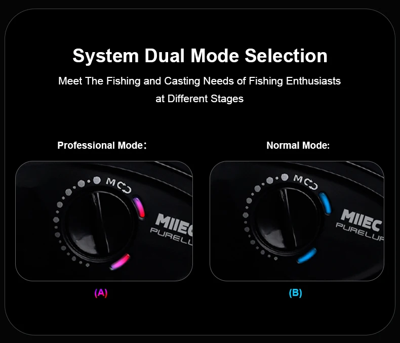 2.Modo MIIEC: dos modos de ajuste, es un carrete de pesca que cualquiera puede controlar fácilmente.El modo profesional maximiza el rendimiento mecánico del carrete de pesca para garantizar la máxima distancia de lanzamiento, lo que requiere que lo utilicen operadores experimentados.El modo profesional parpadea en rojo y azul.El modo normal controla inteligentemente el sistema bajo la premisa de garantizar la distancia de vuelo, asegurando la distancia adecuada sin explotar fácilmente la línea.El modo normal tiene una luz azul.