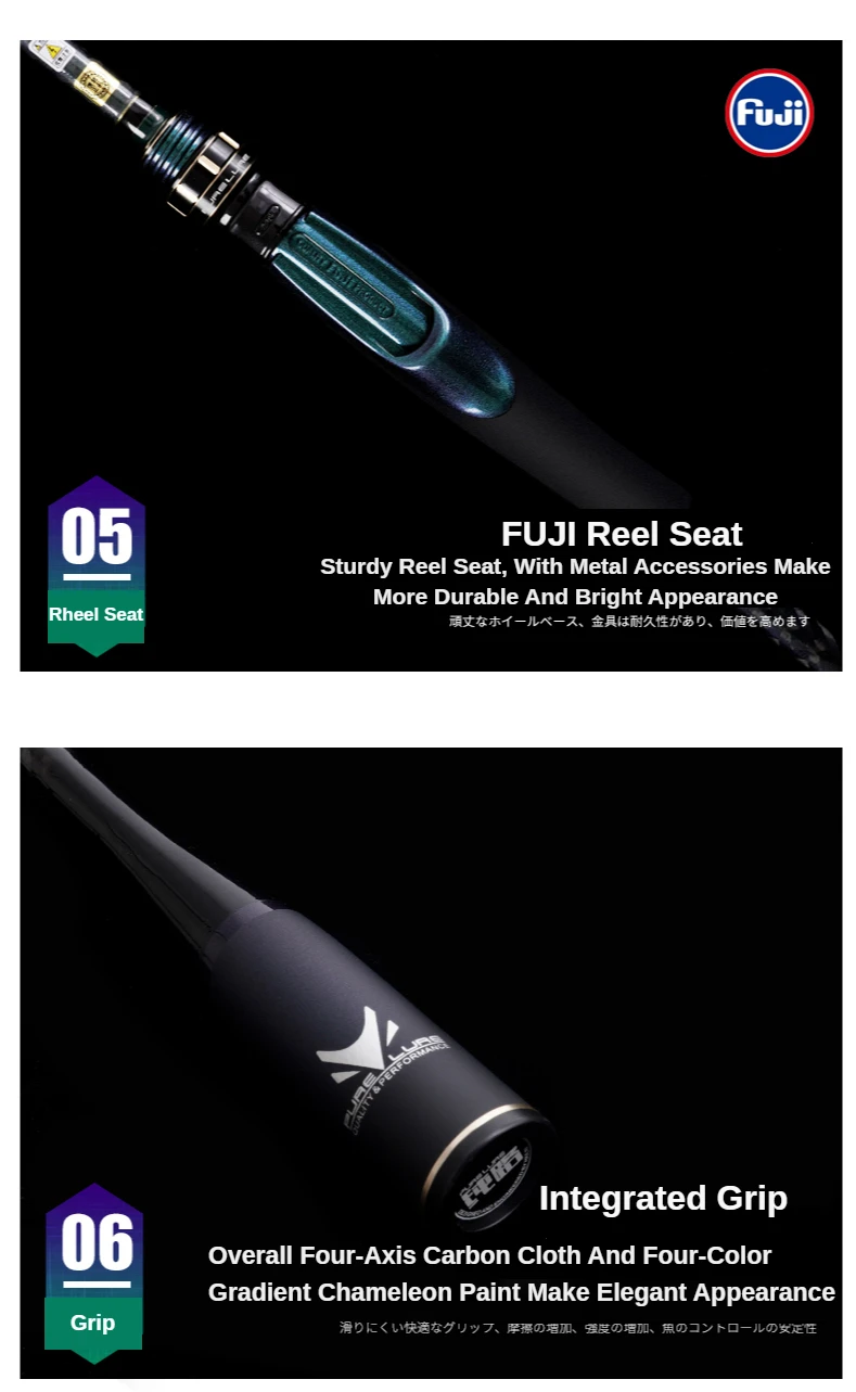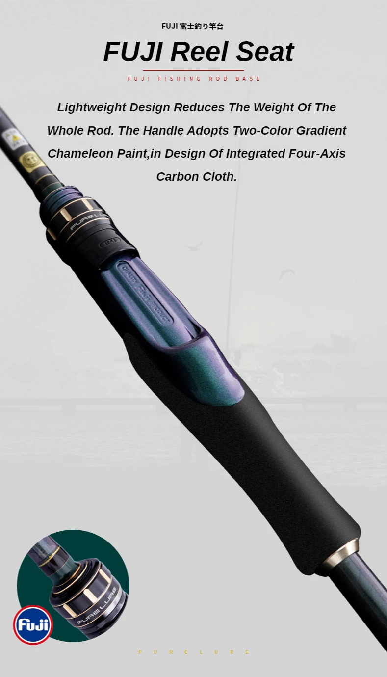 2. Asiento de carrete FUJI, diseño ligero que reduce el peso de toda la varilla. El mango adopta pintura camaleónica degradada de dos colores, en diseño de tela de carbono integrada de cuatro ejes.