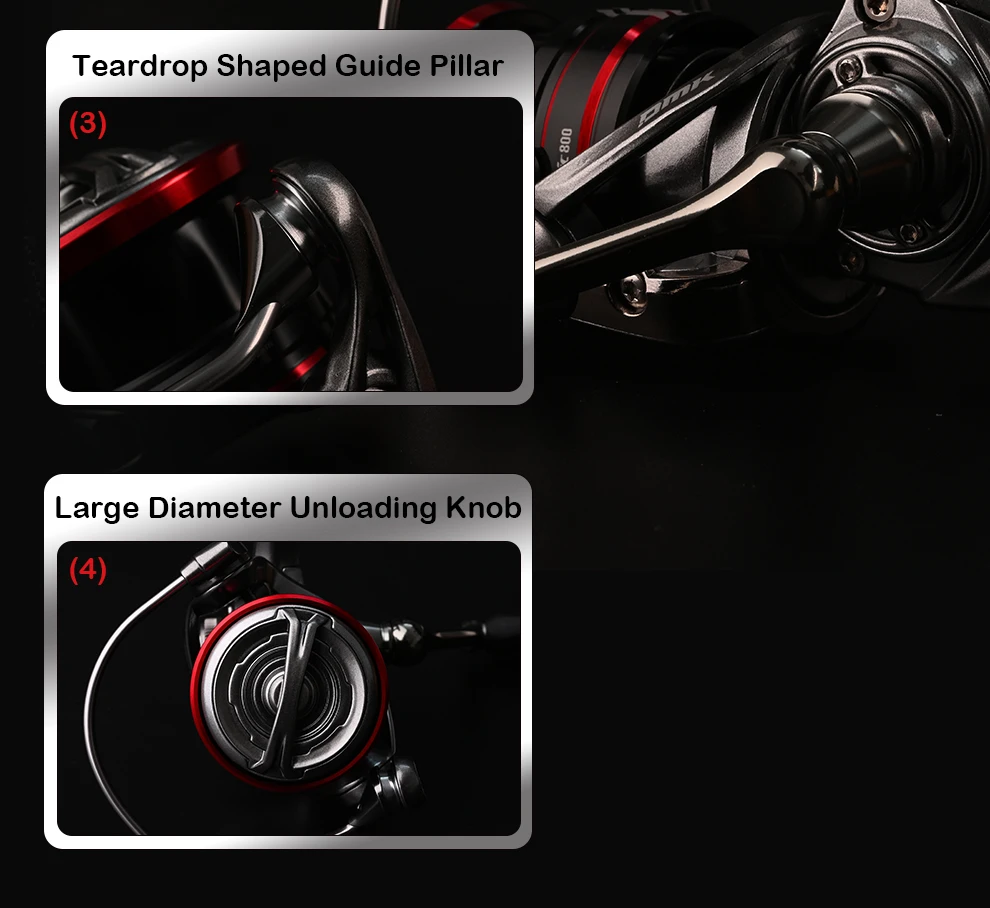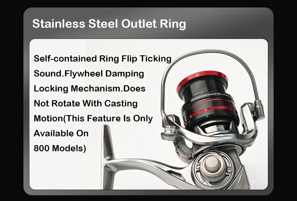 Sonido de tictac de giro de anillo autónomo. Mecanismo de bloqueo de amortiguación de carrete de mosca. No gira con movimiento de fundición (esta característica solo está disponible en los modelos 800)