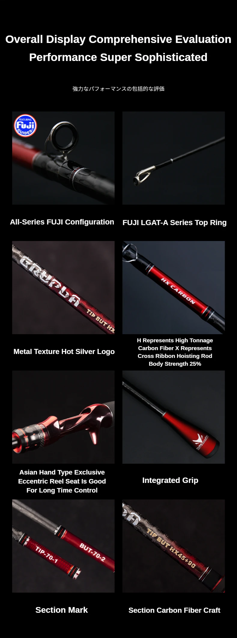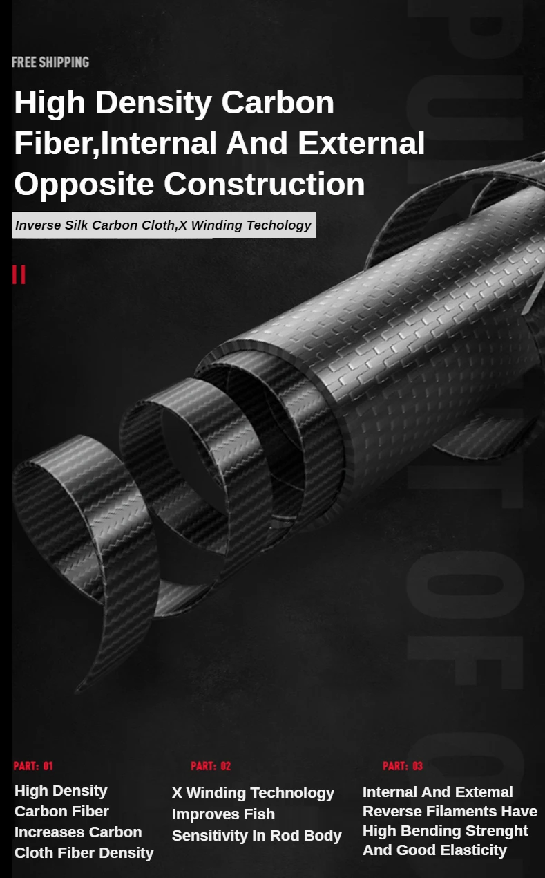 4. La sección de la caña utiliza tecnología de fibra de carbono, el cuerpo de la caña es rígido y la cintura es fuerte, que puede soportar la pesca de alta carga.