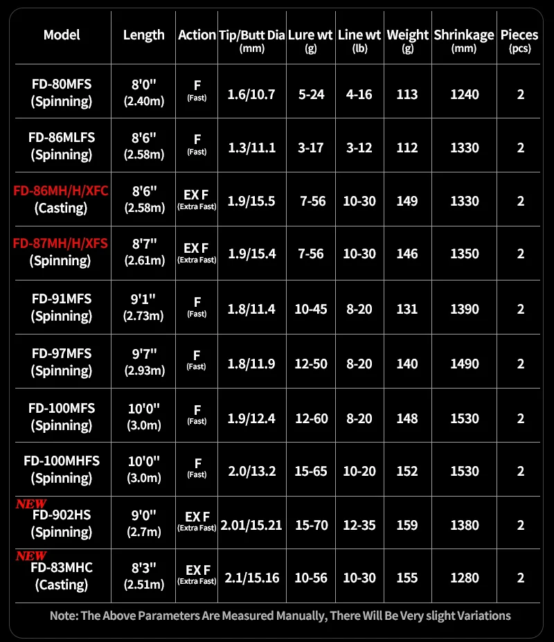 FD-91MFS (Tipo: Spinning, Longitud: 9'1", 2,3 m, Acción: Rápido, Potencia: Medio, Peso del cebo: 10-45 g, Peso de la línea: 8-20 lb, Piezas: 2 piezas)