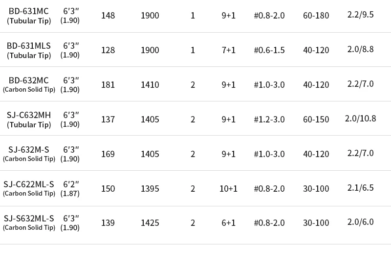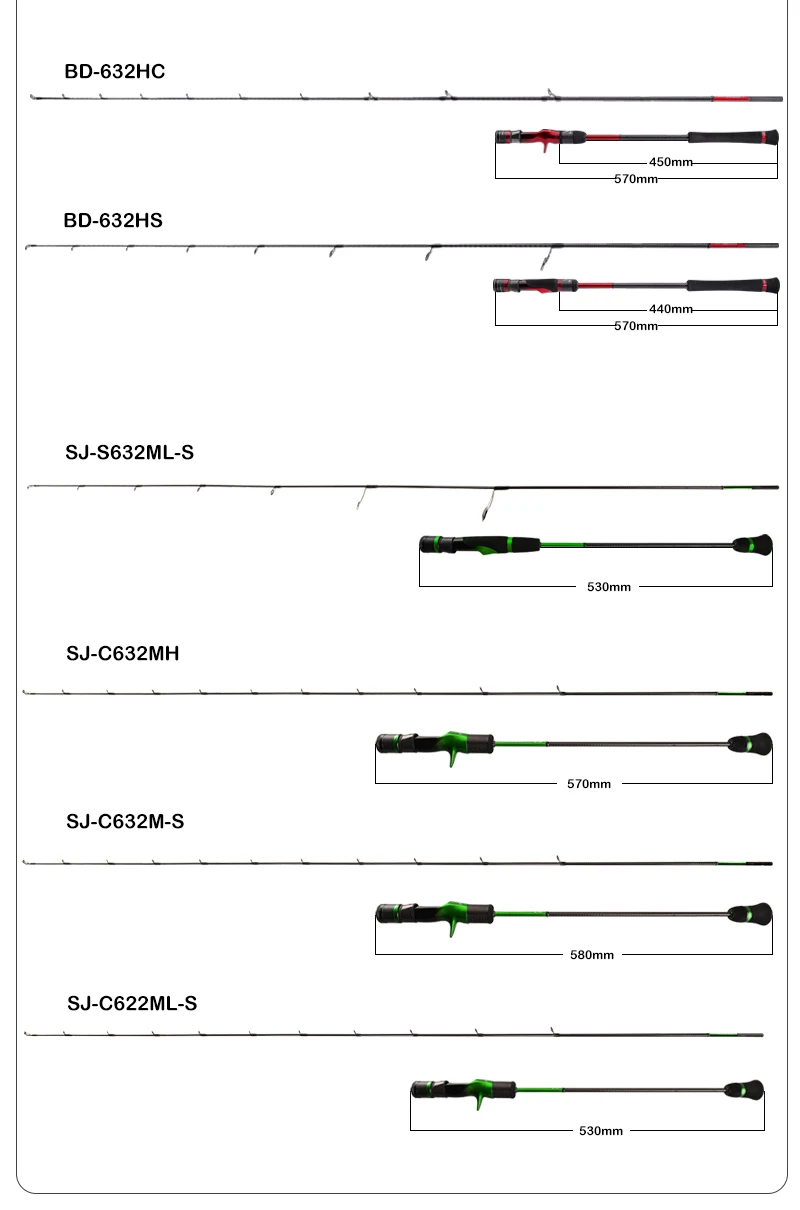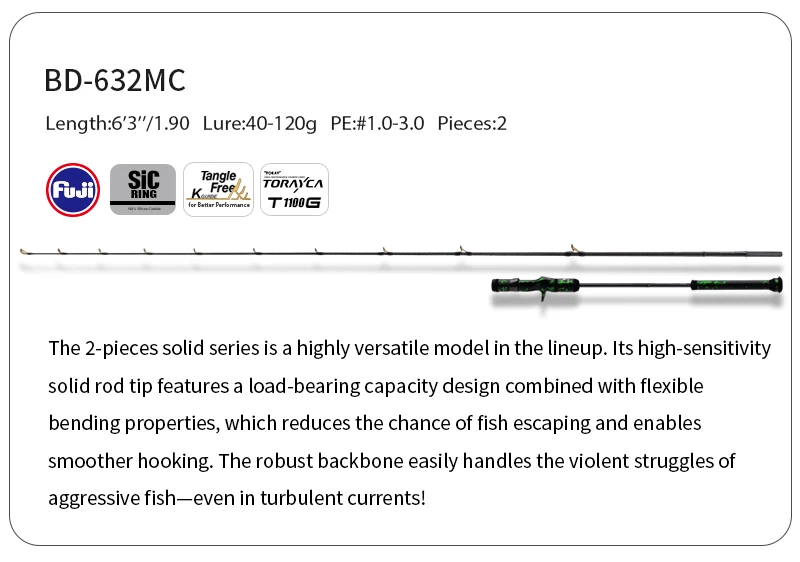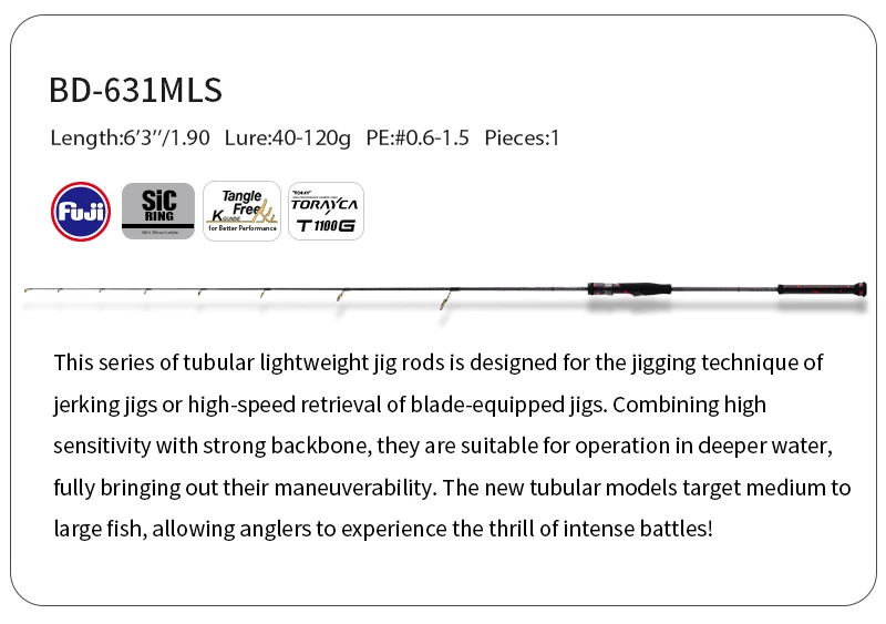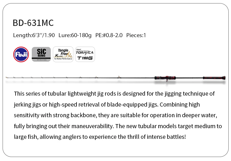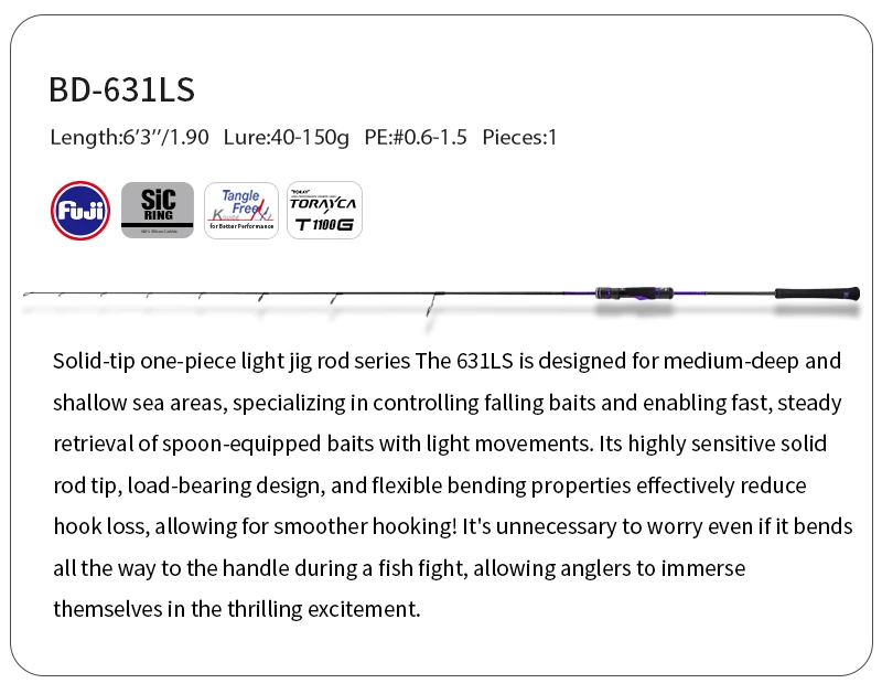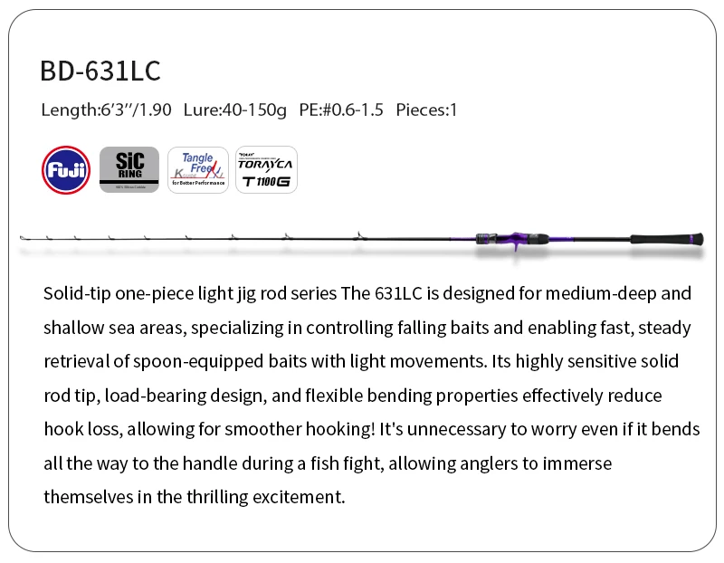 El 631LC está diseñado para zonas marítimas medias-profundas y poco profundas, especializándose en el control de cebos que caen y permitiendo una recuperación rápida y constante de cebos equipados con cucharas con movimientos ligeros.Su punta de varilla sólida altamente sensible, su diseño de carga y sus propiedades de flexión flexibles reducen eficazmente la pérdida de gancho, lo que permite un enganche más suave.No es necesario preocuparse incluso si se dobla hasta el mango durante la pelea de los peces, lo que permite a los pescadores sumergirse en la emocionante emoción".