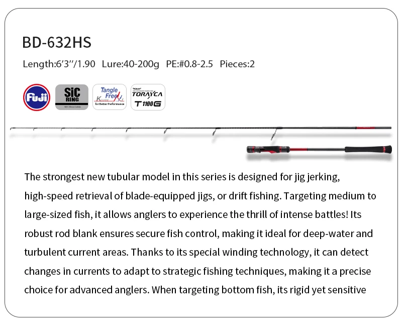 La punta es suave mientras que la columna vertebral es fuerte, lo que permite la detección precisa de las picaduras de peces inferiores, el enganche inmediato, el levantamiento eficiente de los peces y la percepción más aguda de las picaduras de peces objetivo.